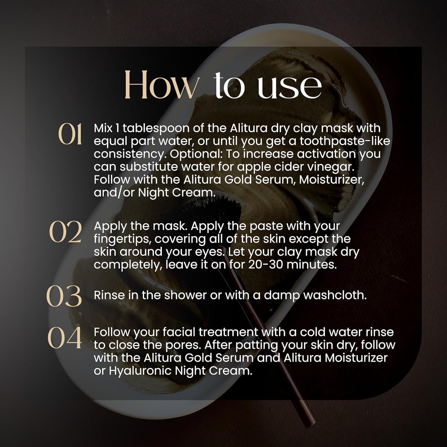 - How to Use for Best Results - In a non-metal bowl, mix 1–2 tablespoons of the clay mask with equal parts water until a smooth, creamy paste forms. Apply evenly to clean skin using fingertips or a brush. Leave on for 20–30 minutes or until fully dry. Rinse thoroughly with warm water, then finish with a splash of cold water to help close pores. Use 1–2 times per week for optimal results.