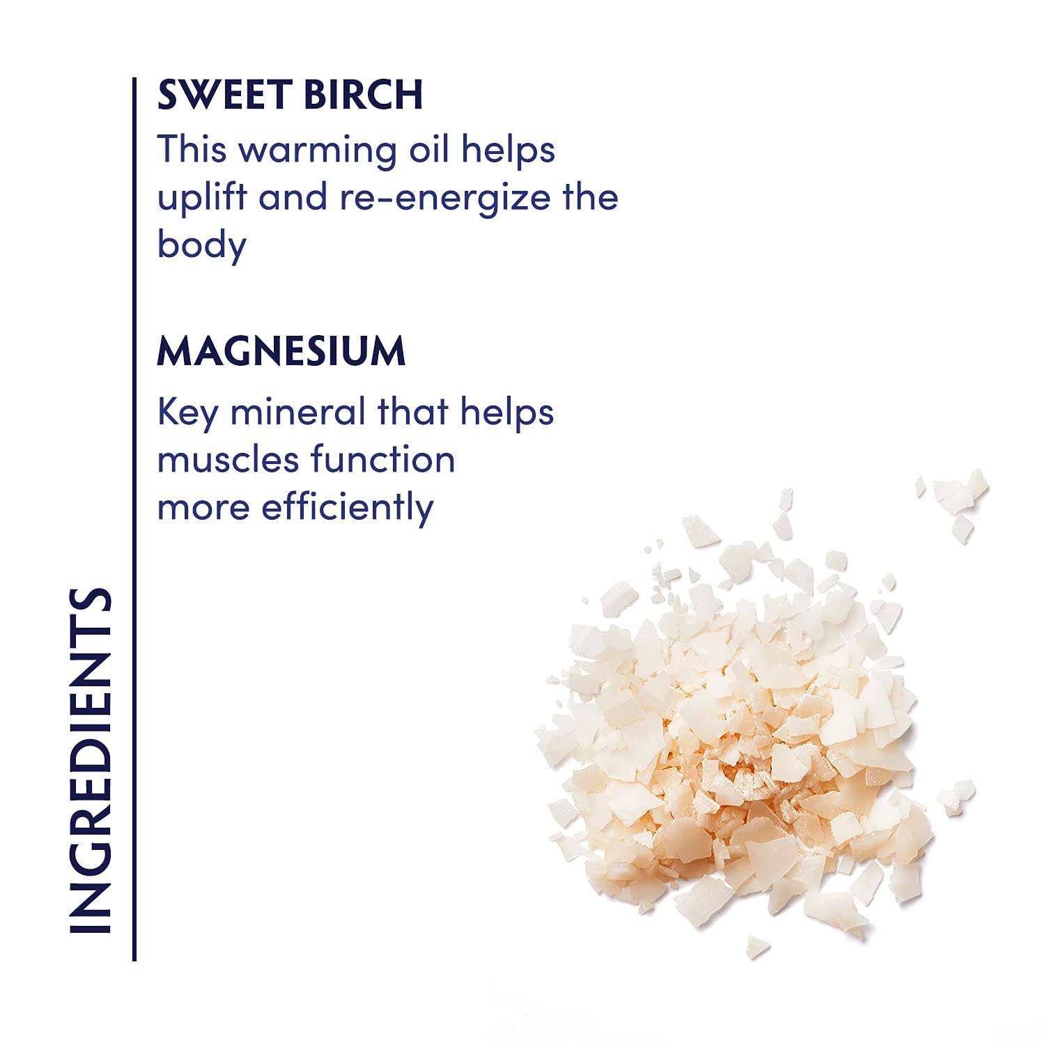 - KEY INGREDIENTS: They're packed with 50% more Magnesium than epsom salts, our Sweet Birch Magnesium Bath Flakes ease the symptoms of muscle discomfort and fatigue.