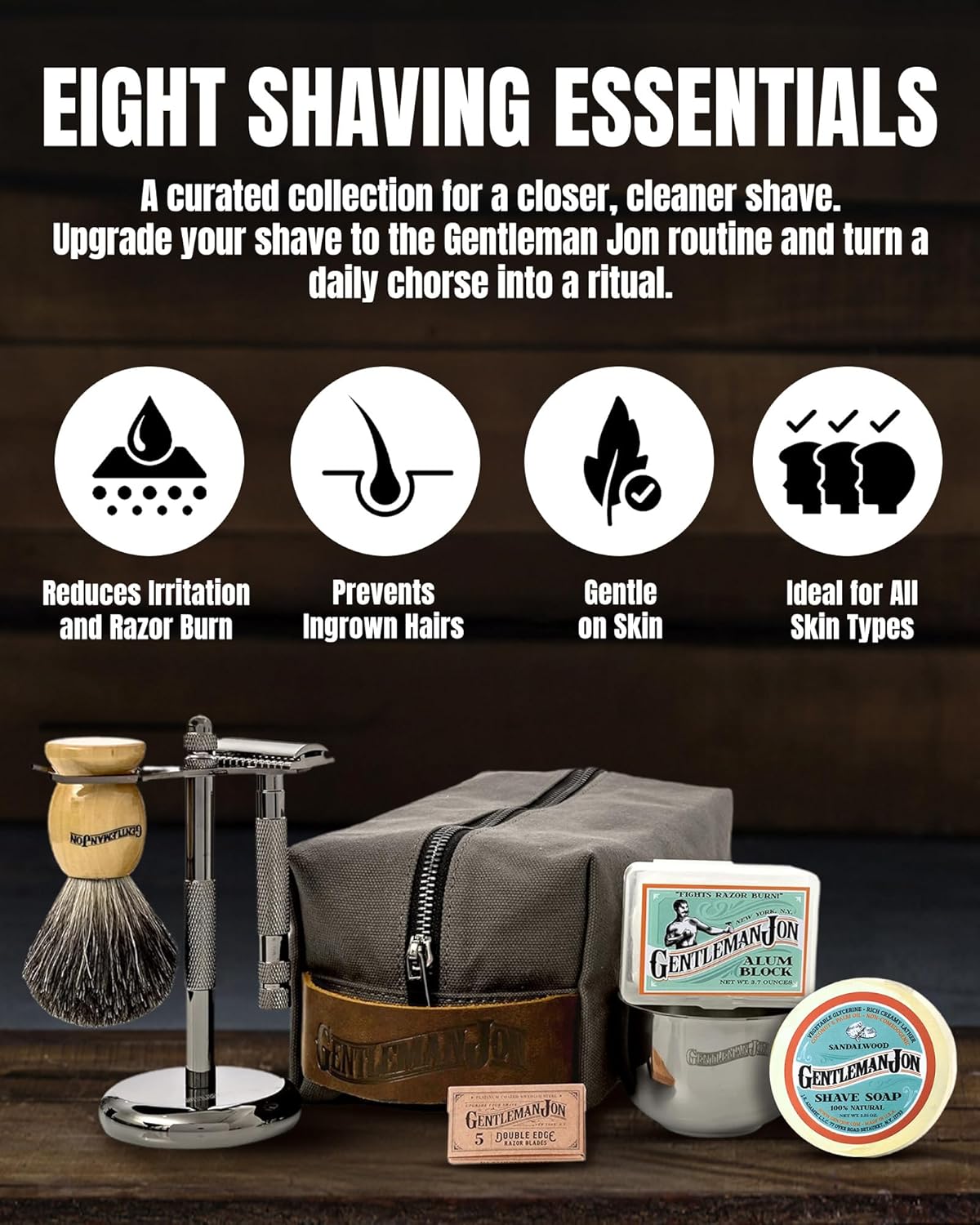 - COMPLETE MEN'S SHAVING KIT: The Gentleman Jon Shaving Kit for Men is a comprehensive set that includes a safety razor, badger hair brush, alum block, shave soap, stainless steel bowl, shaving stand, canvas & leather dopp kit, and five razor blades - everything needed for a luxurious, comfortable and smooth wet shave experience. With its compact design, our product is also a suitable travel companion to those who value traditional shaving, ensuring a neat shave even while on the go.