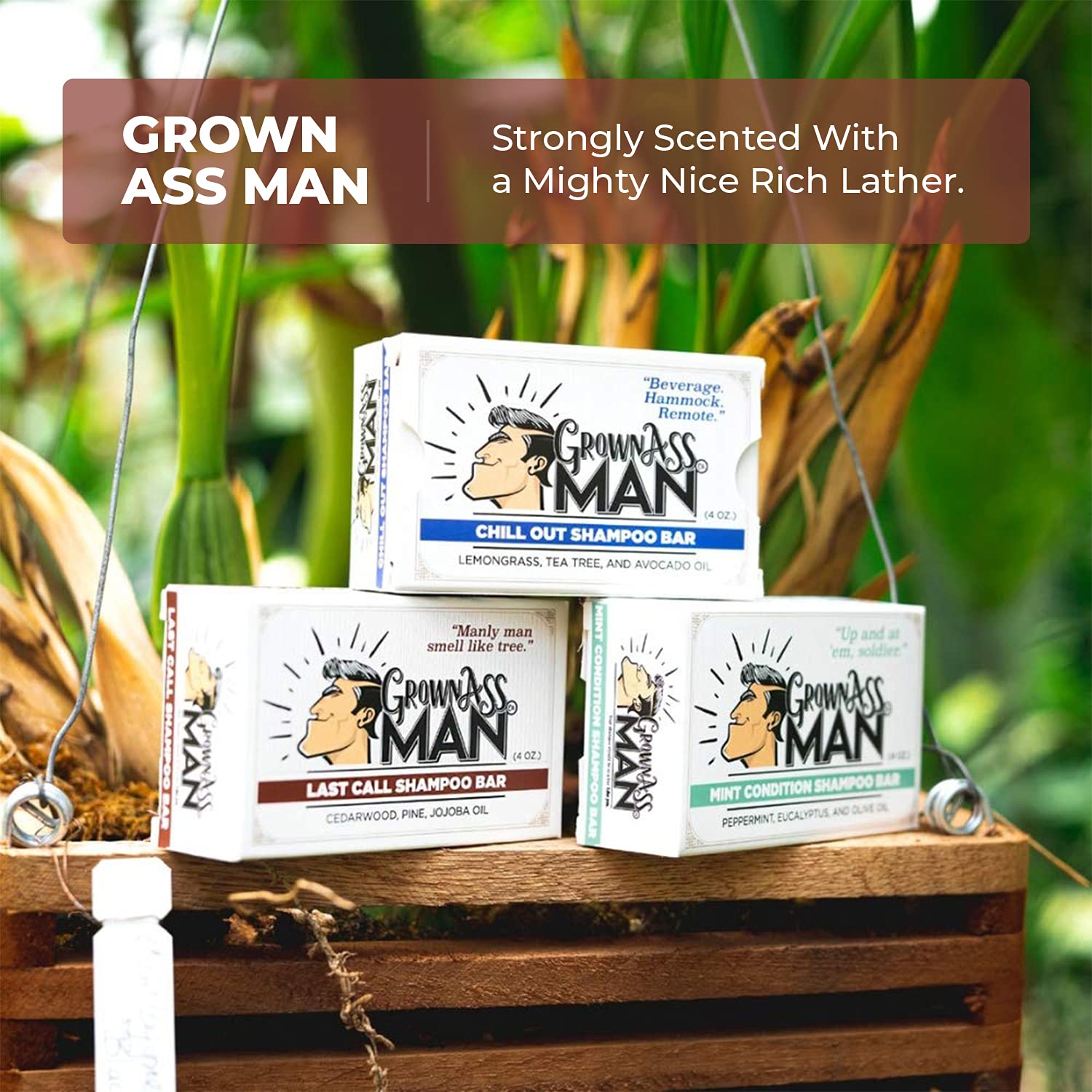 - STRONGLY SCENTED WITH A MIGHTY NICE RICH LATHER: We want you to smell good all day, and, after all - you're a man and you might not even notice unless we made it strong. The rich lather makes sure that the fine ingredients we build into every Grown Ass Man Co., Shampoo bars reach all of your hairs and your scalp. Lather has a purpose? Oh yes. Yes it does.
