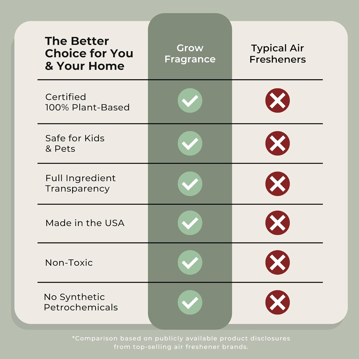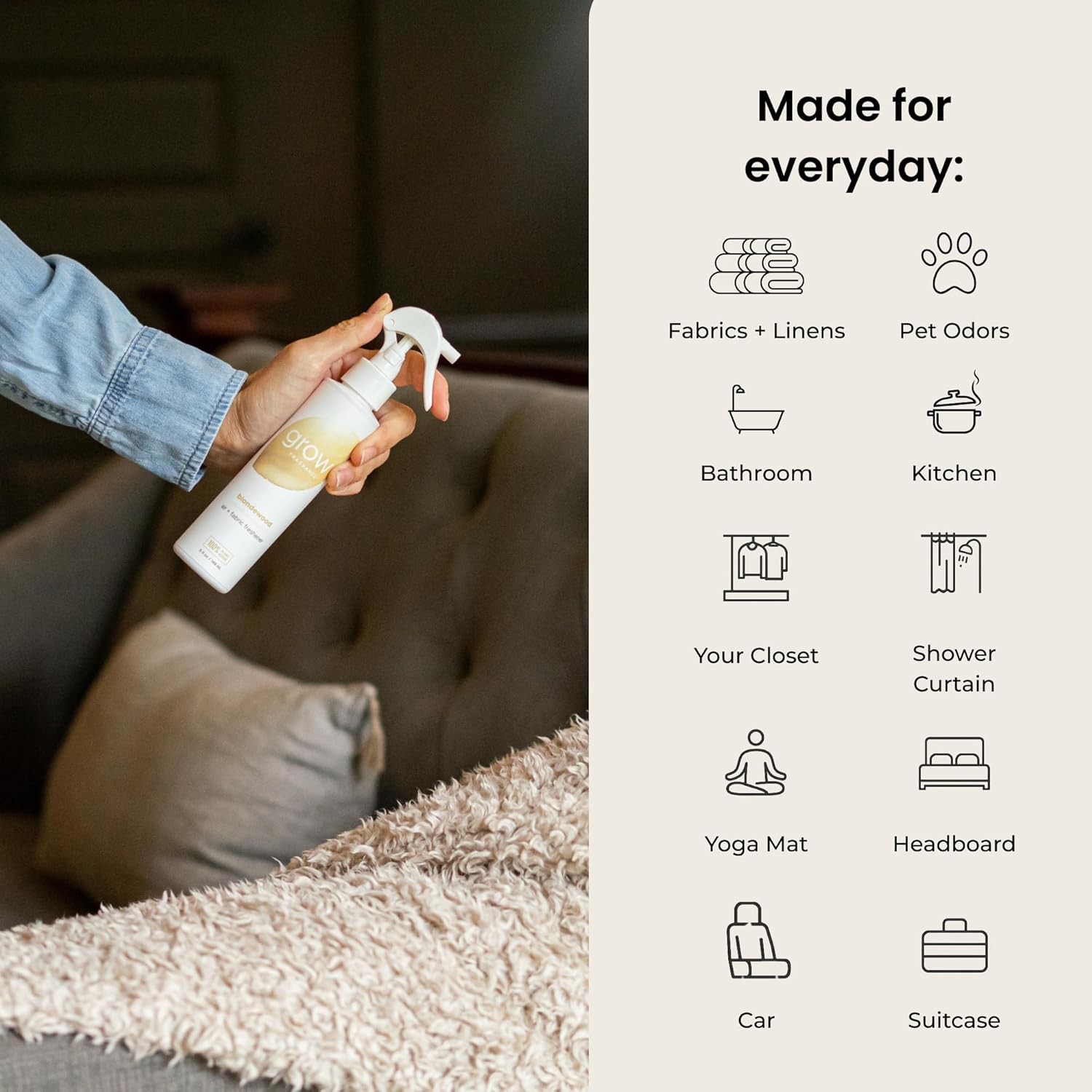- Rejuvenate Your Space: Rely on the refreshing scent of all-natural essential oils, captured perfectly in Grow Fragrance Fabric and Room Air Freshener Sprays. Crafted with care by master perfumers, our spray is a certified non-toxic, 100% plant-based solution to traditional air fresheners.