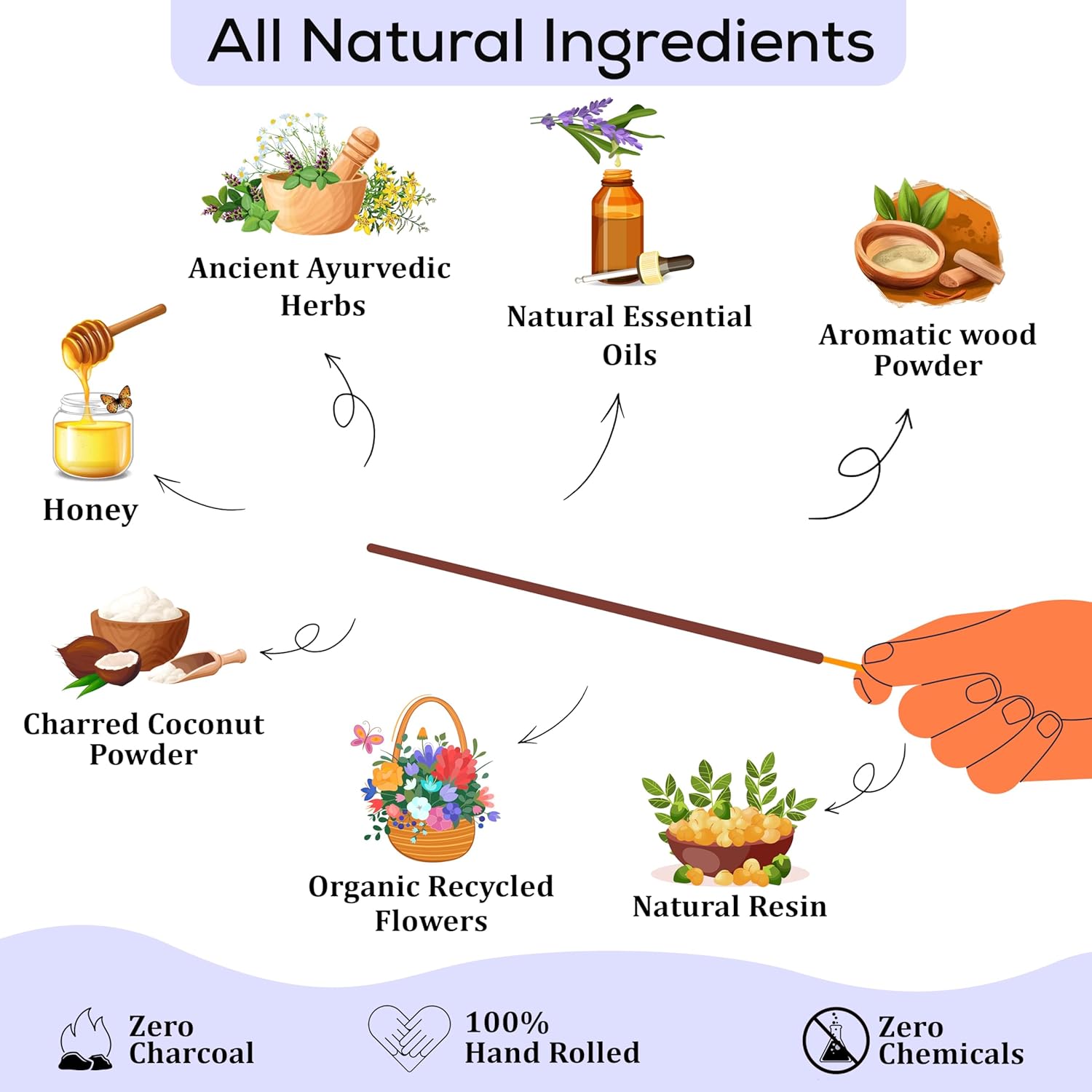 - Guarantee 100% natural incense sticks chemical free organic, pure herbal ingredients without any chemical fragrance. You can free return for any reason.