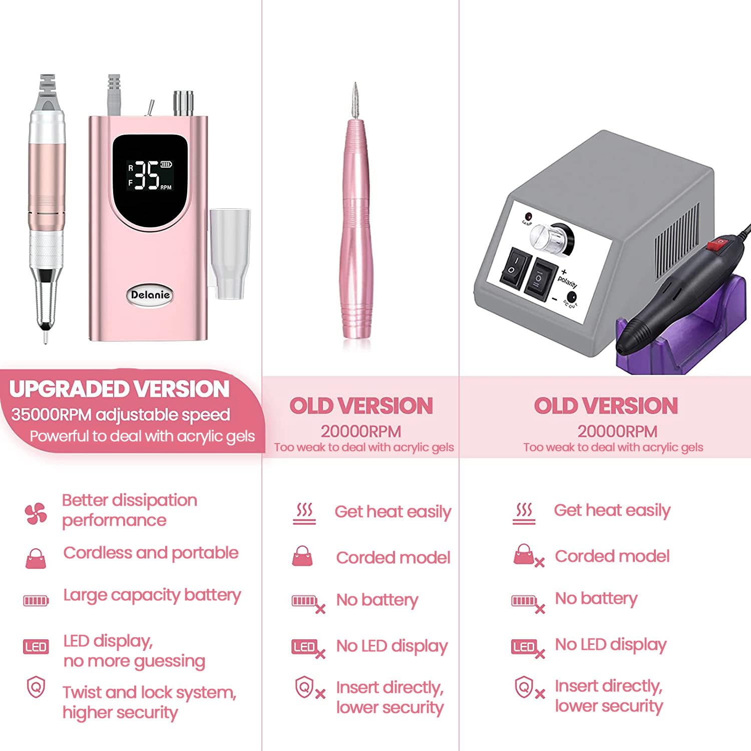 - 【Exclusive high-torque motor】 The industry-leading motor exclusive for the Delanie Nail Master e-file nail drill delivers of high torque of up to 4.5N.cm to smoothly file off any nail products, cut or shape any artificial nails without stopping on nails
