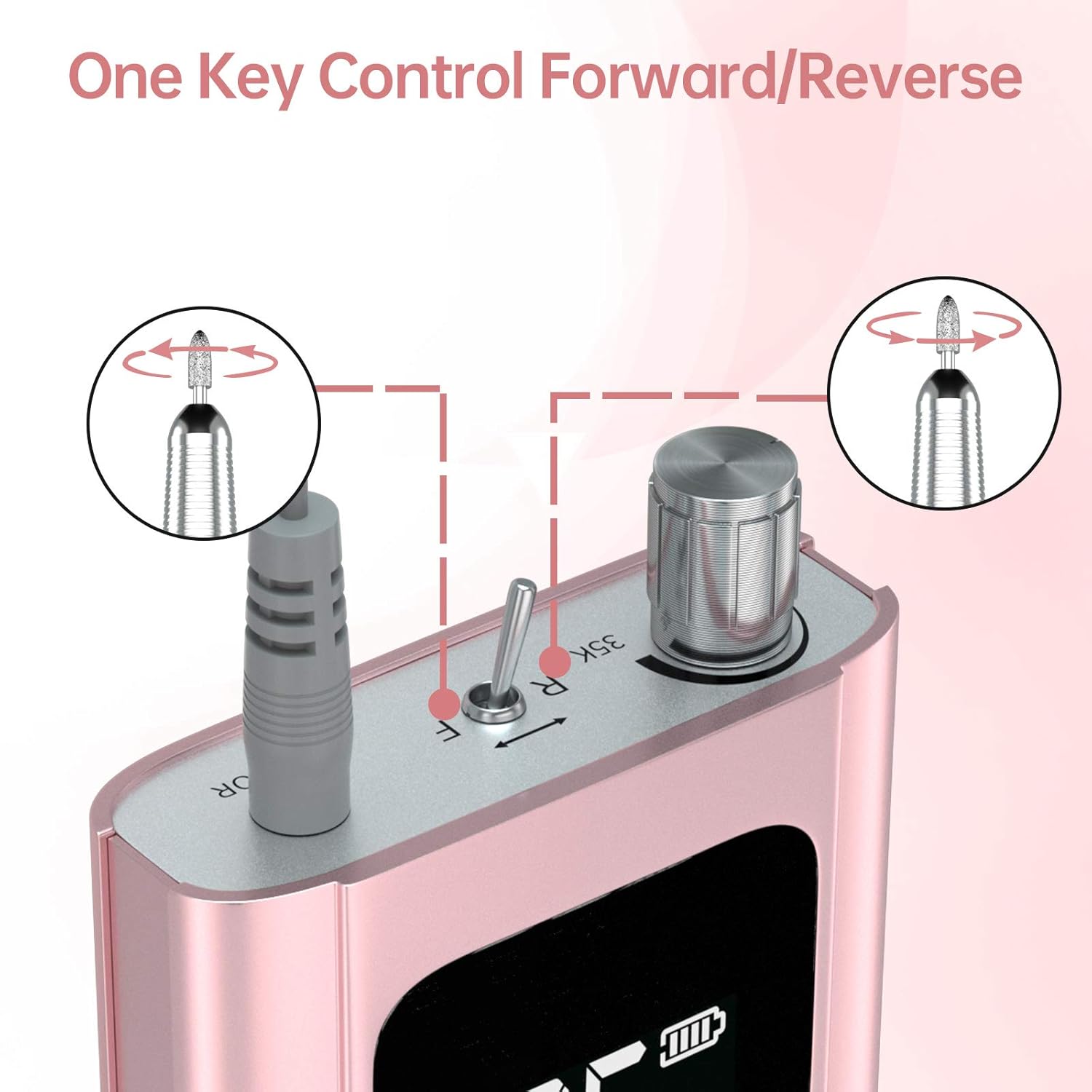 - 【Easy to use】0 rpm option for fast start/stop. The toggle switch instead of a button for easy, straight-forward direction setting. Smart screen for monitoring the nail drill's speed, direction, and battery status