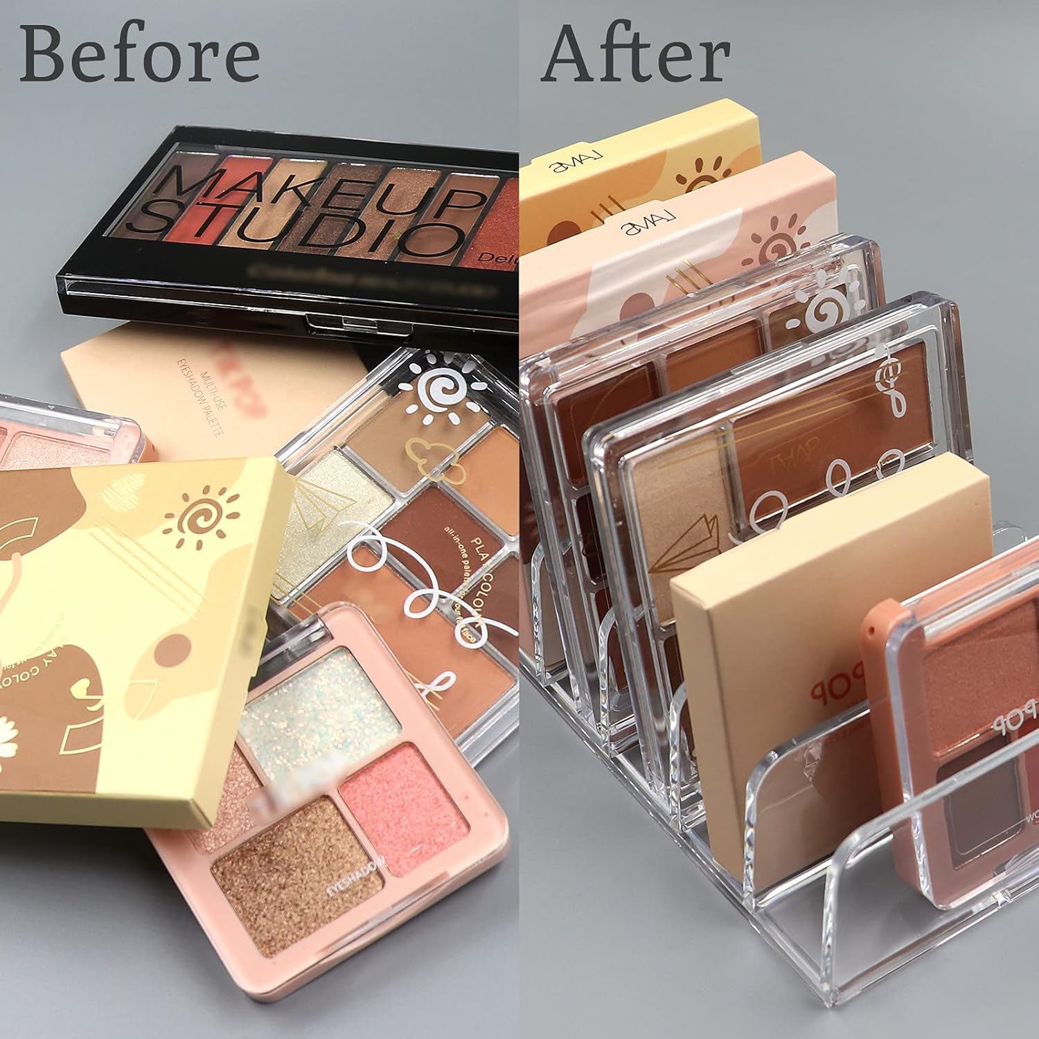 - ăSits Vertically Or HorizontallyăMade for makeup lovers, makeup artists and teenagers, this functional makeup pallet organizer is a great addition to any vanity or bathroom countertops. Designed to stand upright on your counter or lay flat inside your makeup drawer, leaving a smaller footprint.