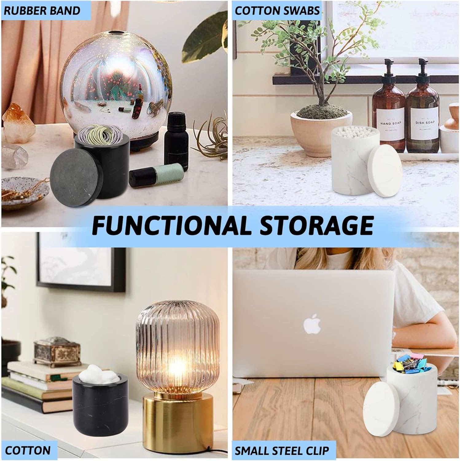 - Tidy & Organized: Versatile marble container can not only store cotton swabs, cotton balls, sponges, cosmetic pads, and other cosmetic accessories, but also rubber bands, jewelry, and even office accessories such as paper clips and book clips. It has a very powerful function to keep your desktop, drawers, and counter space neat and organized all the time