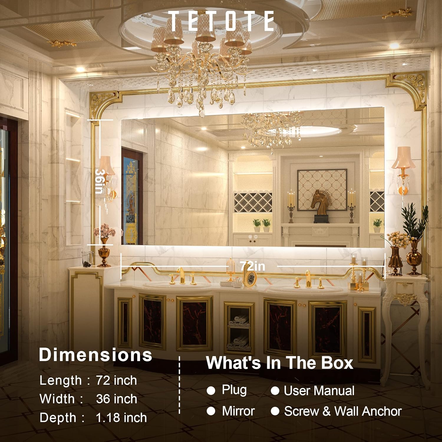 TETOTE 72 x 36 Inch LED Backlit Bathroom Mirror with Lights,3Color White/Warm/Natural,Anti-Fog Lighted Mirror,Dimmable,Vanity Mirror,Wall Mounted