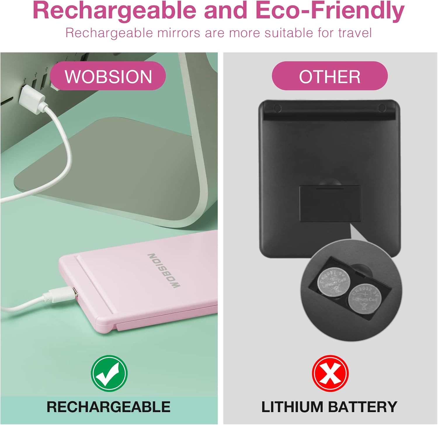 - Rechargeable Travel Makeup Mirror:No need batteries,long lasting,one charge can last for 4-5 hours,only takes 1-2 hours to fully charge