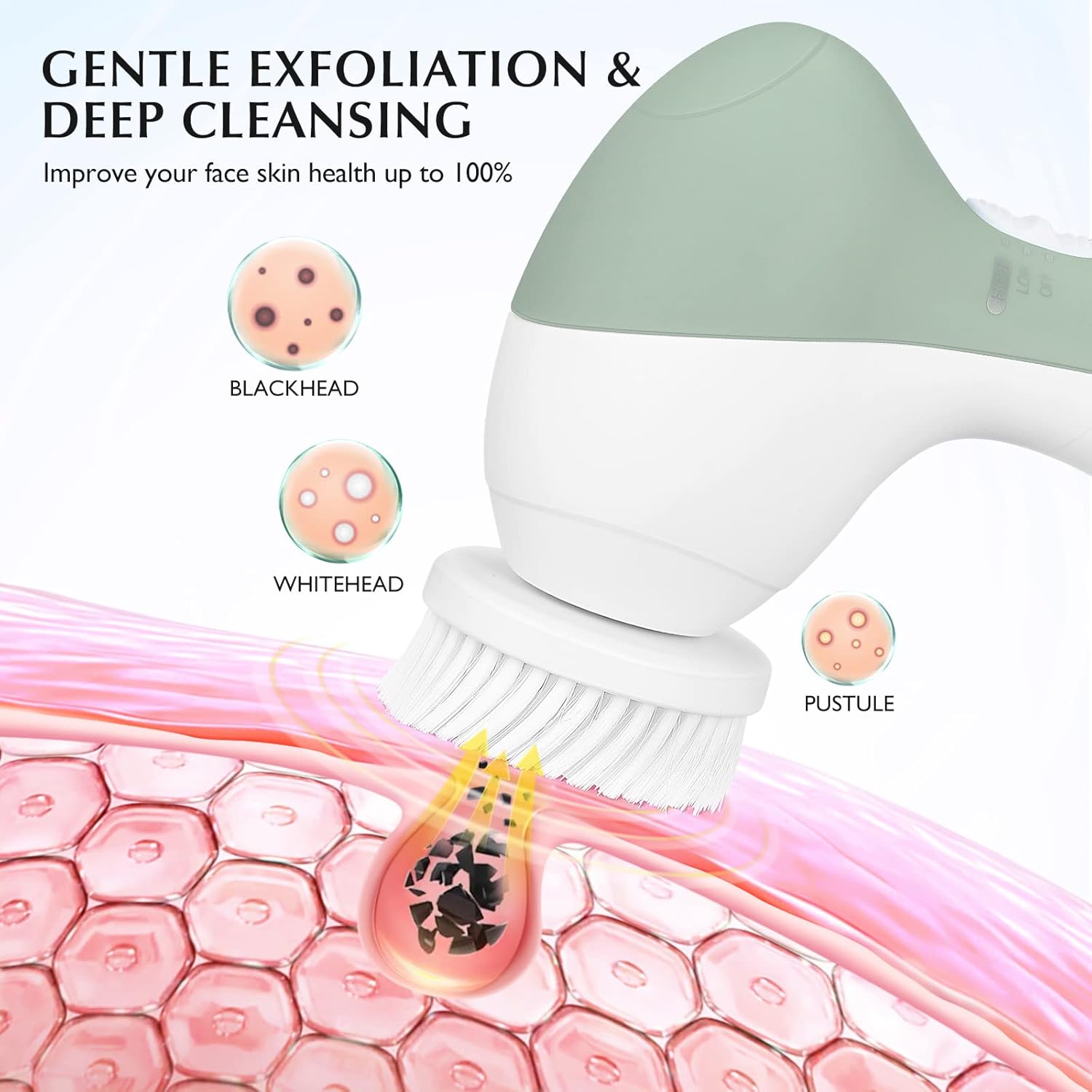 - GENTLE EXFOLIATING & DEEP CLEANSING: Our portable gentle silicone face scrubber tool have 2 rotation speeds meet the cleansing needs, including: low-speed gentle exfoliating and daily cleansing, high-speed deep cleansing pores and exfoliates dead skin, The motor is designed to provide sufficient rotation power for the portable facial brush, which is 6 times more effective than washing by hands