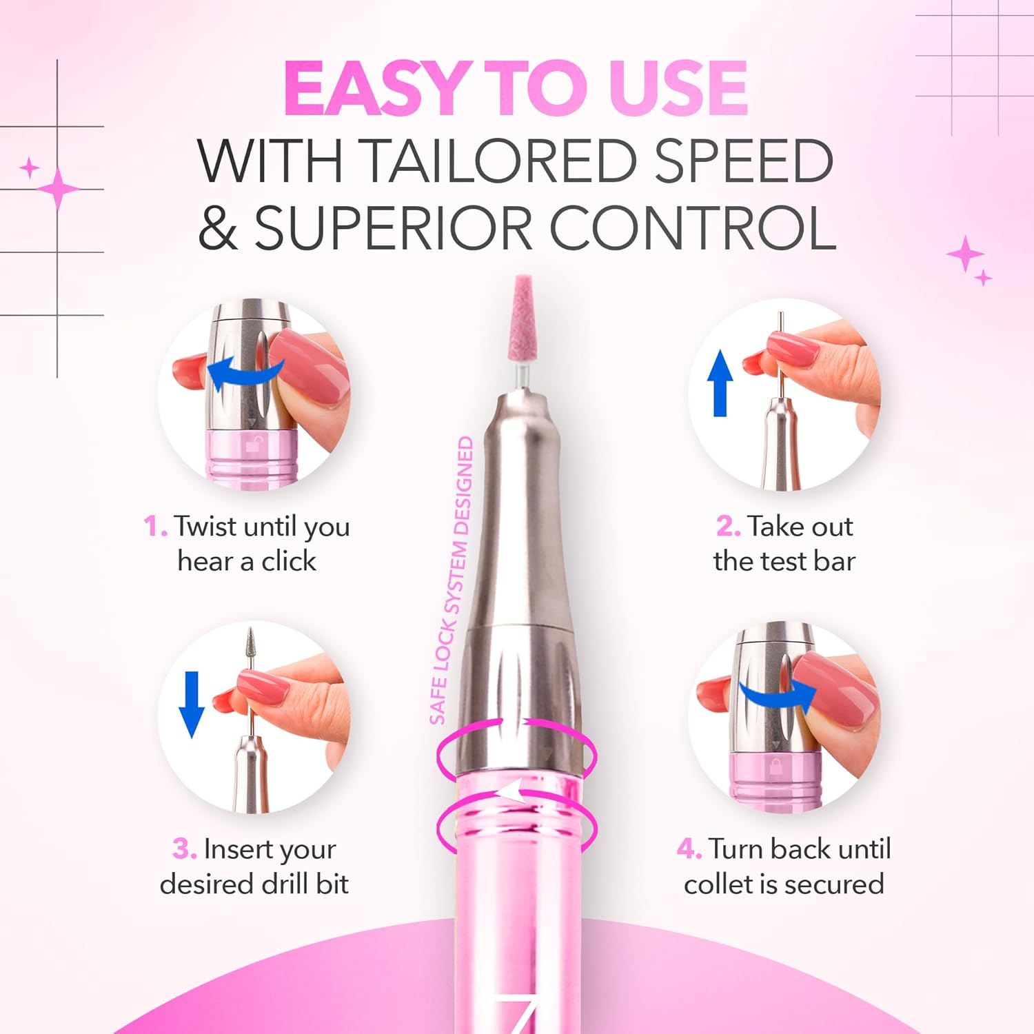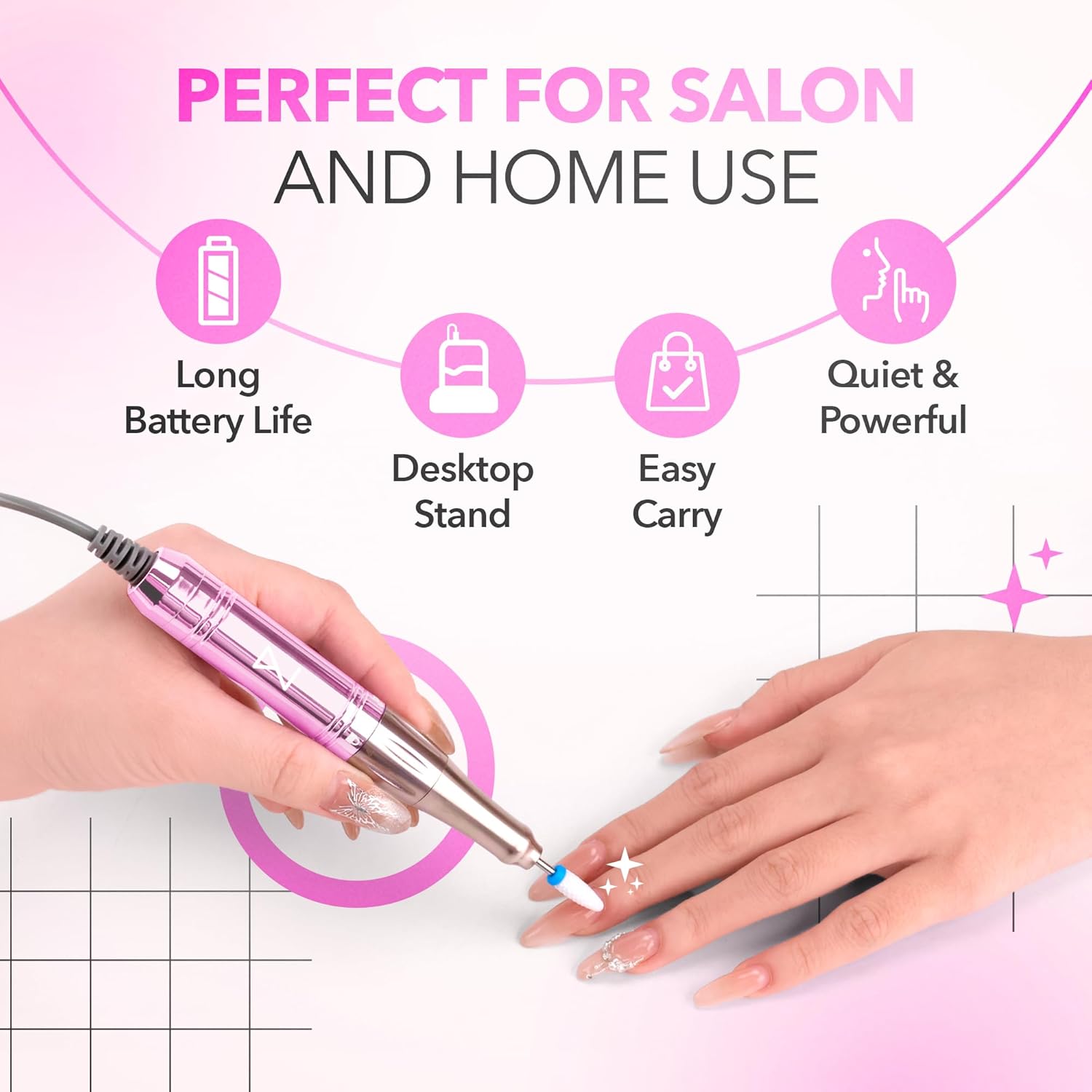 - DESIGNED FOR SALON QUALITY NAILS: The M cordless nail drill is a must-have for professionals and beginners to obtain flawless nails quickly and easily. Master the art of flawless nails with this powerful, adjustable, and user-friendly efile nail drill
