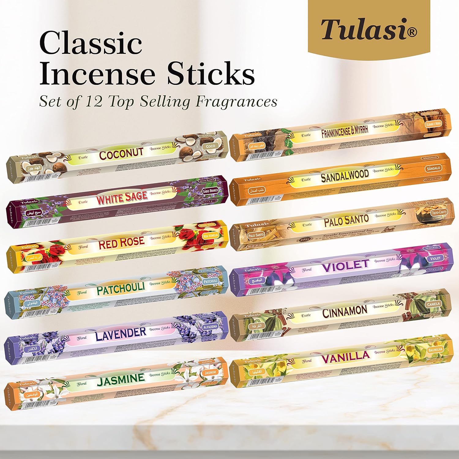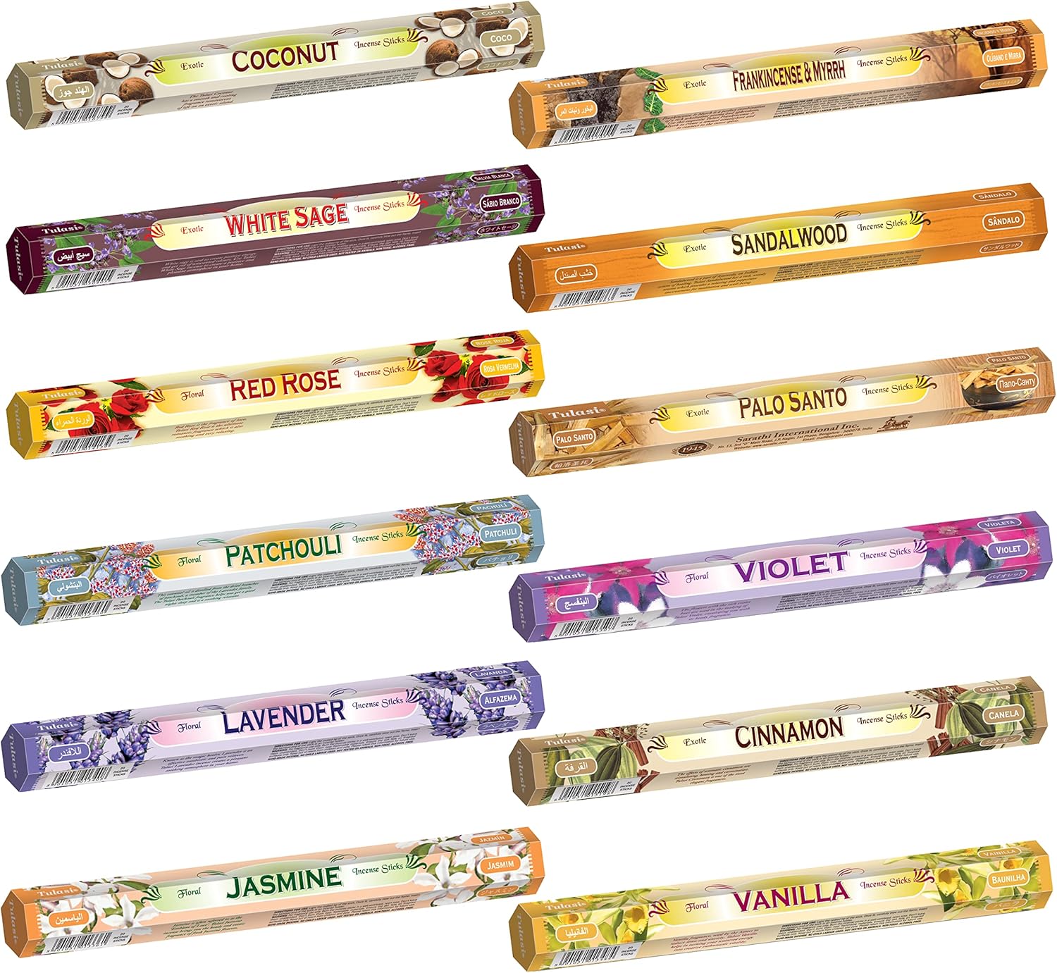 - SET INCLUDES: 240 incense sticks (12 x 20Pc). This Tulasi Incense Stick Gift Pack includes 12 different fragrances boxes, each box contains 20 sticks | Coconut, White Sage, Red Rose, Patchouli, Lavender, Jasmine, Frankincense & Myrrh, Sandalwood, Palo Santo, Violet, Cinnamon, and Vanilla.