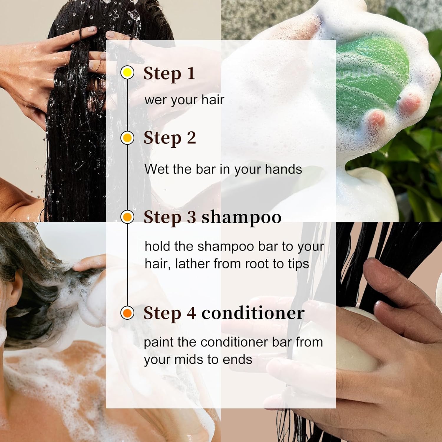- hair moisturizing & refreshing: shampoo bar soap and conditioner bar contain shea butter, sea salt and many other natural plant ingredients, support the healthy development of hair and scalp, balances oil in scalp, nourishes hair roots, resulting in soft, smooth, shiny hair.