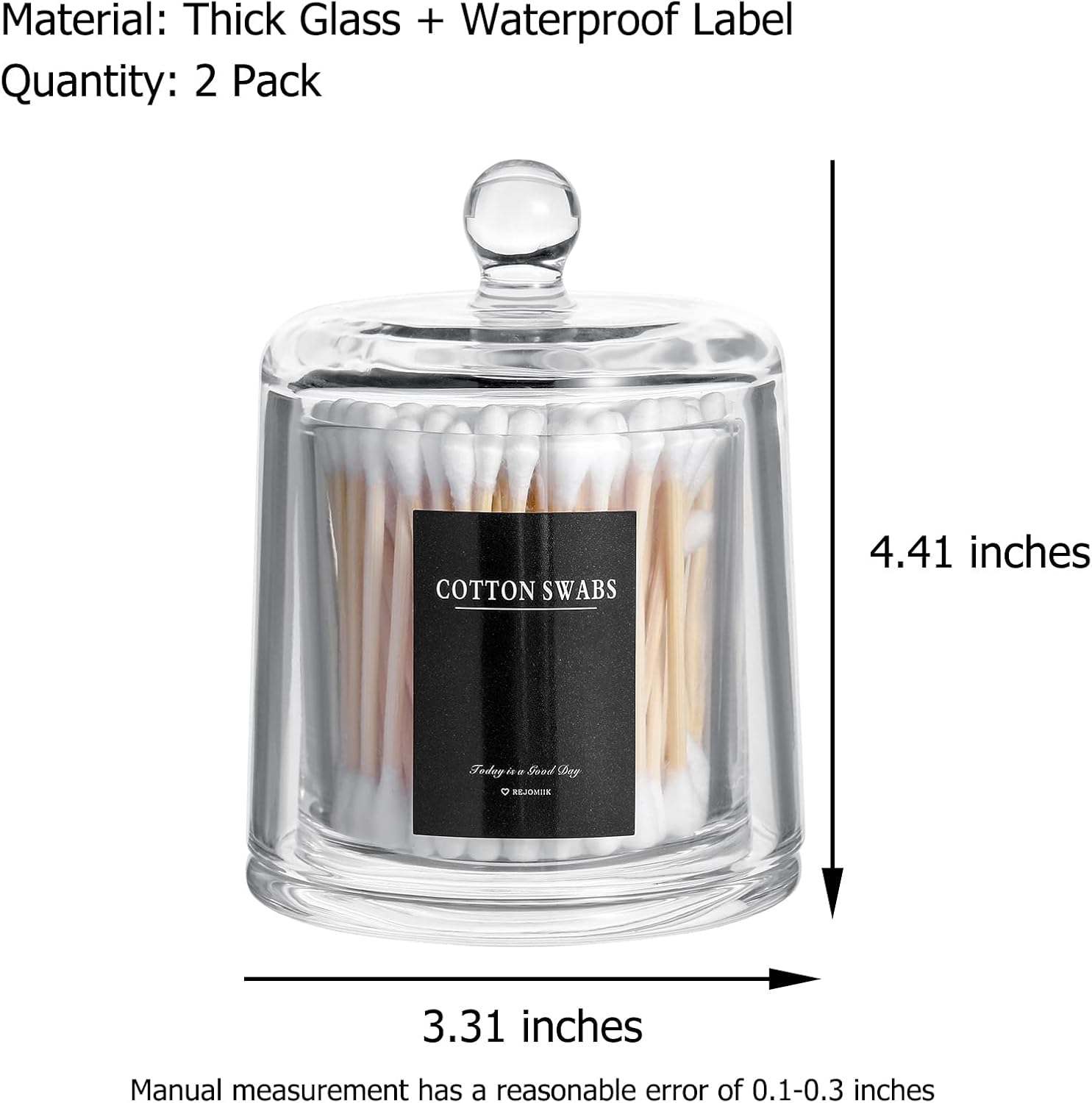 - Ideal Size Bathroom Accessories: rejomiik qtip holder Item Includes 2 packs, 3.31" Wide, 4.41" Height, Clear glass jar with lid dispenser for such as Q-tip, cotton ball, cotton swab, cotton rounds, floss picks, tampon, bath salts, hair tie band, makeup brush, beauty egg, face brush, crayons, candy, pens, clip, and more small things