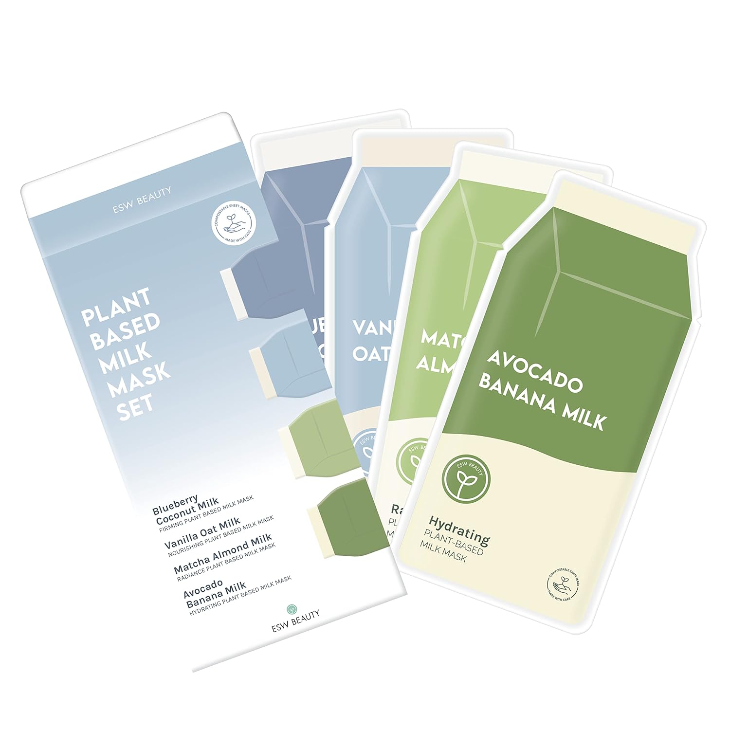 ESW Beauty Plant-Based Milk Face Masks - 4-Pack Skincare Set - Hydrating, Radiance, Firming & Soothing with Avocado, Matcha, Blueberry, Vanilla & Oat Extracts for All Skin Types