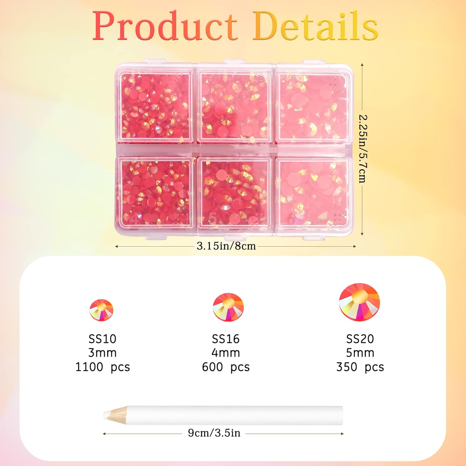 - 3 Sizes Rhinestones Set with Pick Up Pen: 2050 pcs per box. Round flat backs &Non Hotfix, SS10 (3mm) 1100PCS, SS16 (4mm) 600PCS / SS20(5mm) 350PCS.