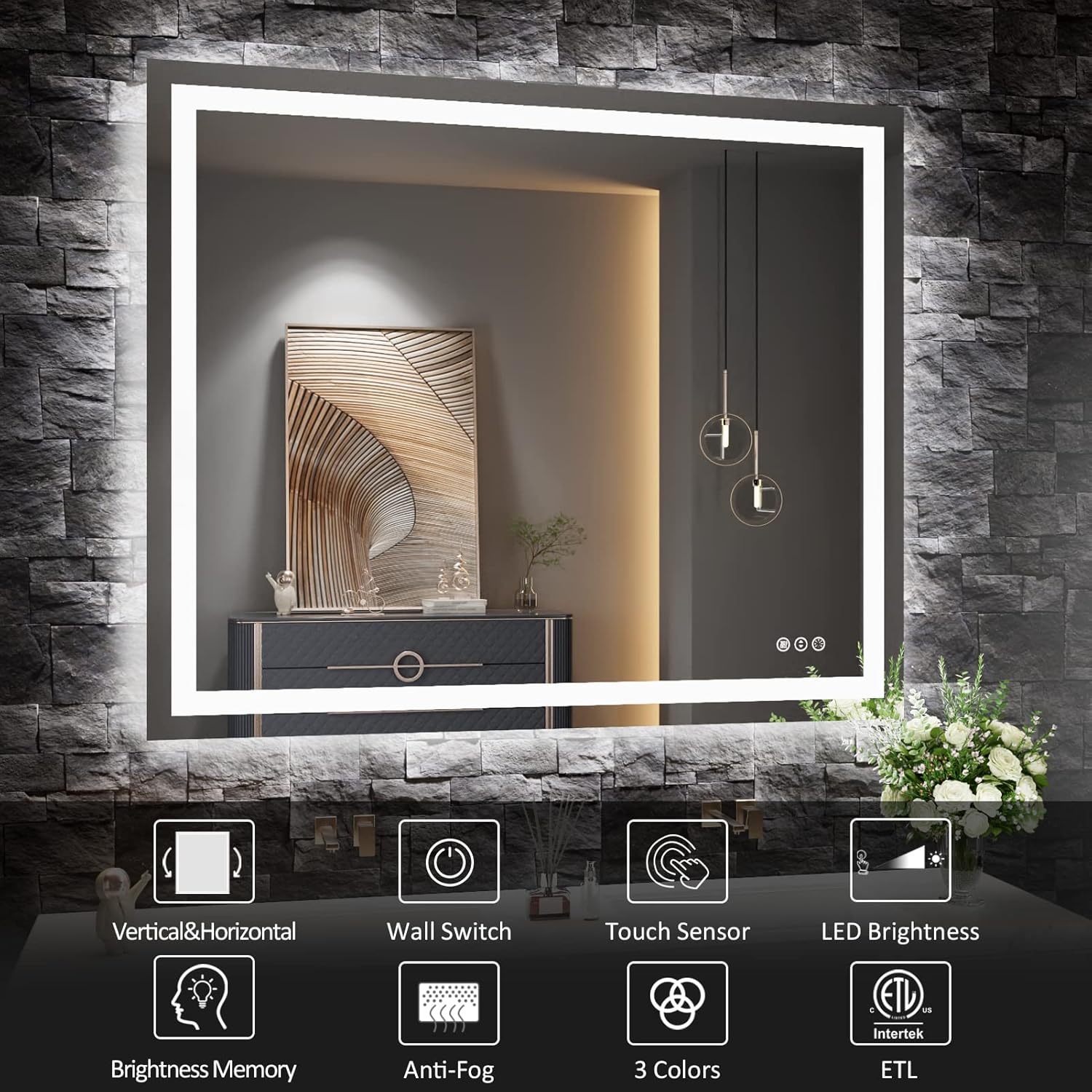 - [Anti-fog]: After a few minutes of opening the defogger, the heater in the mirror will disperse the fog from the center to sides, the mirror will still reflect clearly in the bathroom surrounded by hot air; It will turn on with the power on and automatically turns off after 1 hour