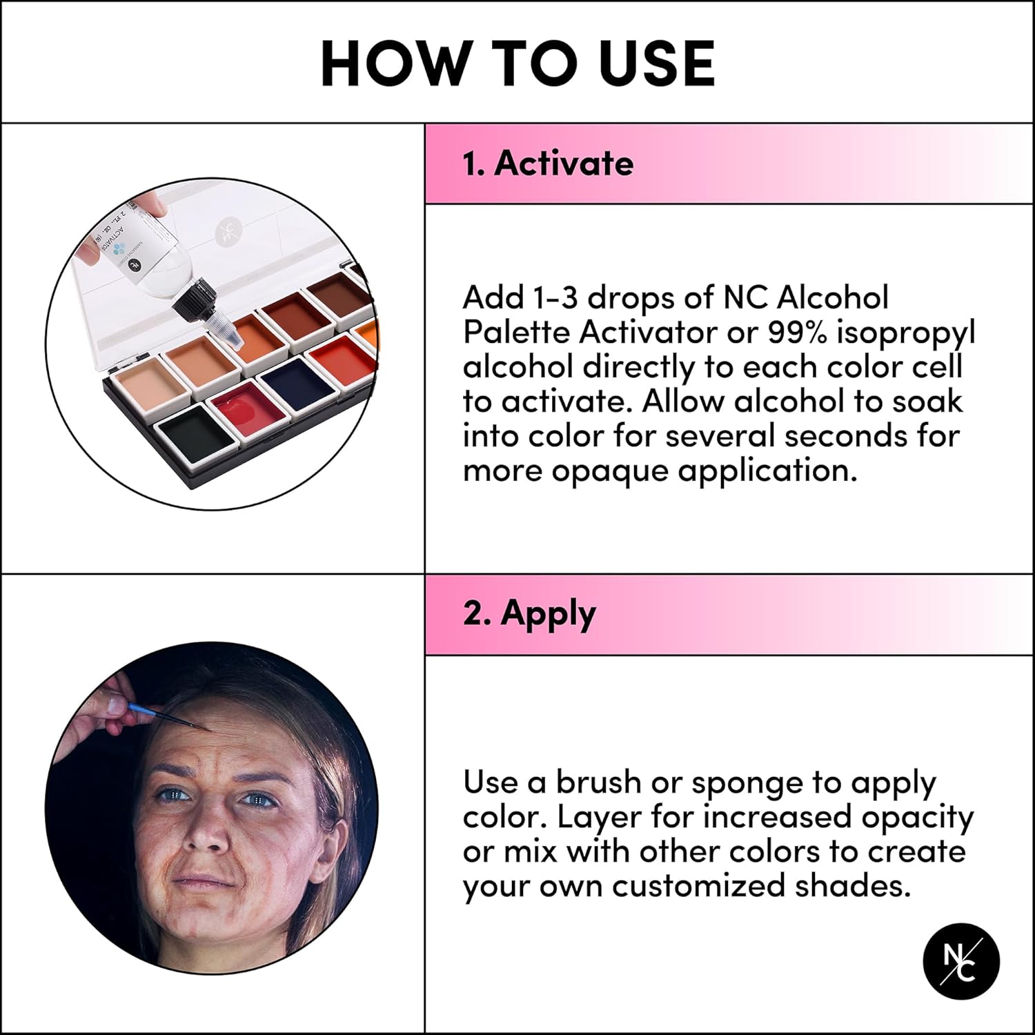 - ALCOHOL-ACTIVATED: Palette colors will appear dry or cracked before activation; Add 99% isopropyl rubbing alcohol or Activator to the pigments before every application