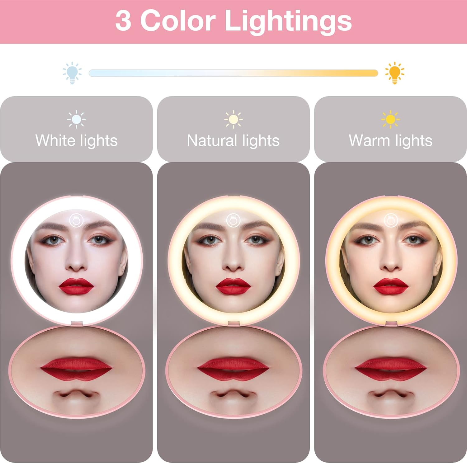 wobsion Rechargeable Compact Mirror, 1x/10x Magnification, Dimmable, Portable, LEDs, 4in Handheld, Pink