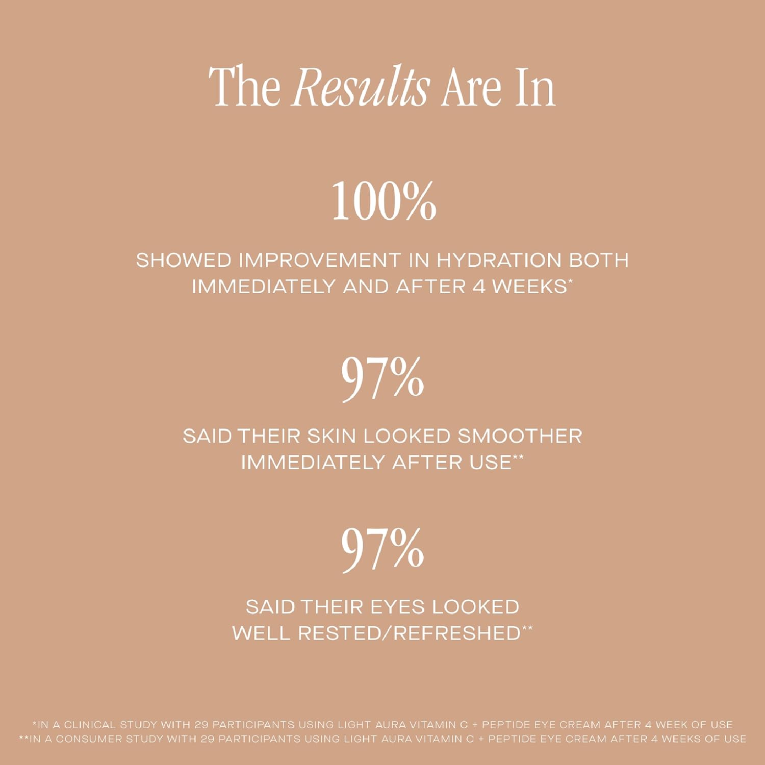 - The Results Are In - In a clinical study with 29 participants using Light Aura Vitamin C + Peptide Eye Cream, 100% showed a measured improvement in hydration both immediately and after 4 weeks.