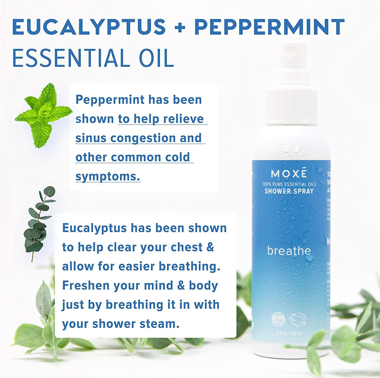 - Transform your shower experience with the power of eucalyptus and peppermint oil. Our 100% natural and organic Breathe aromatherapy shower spray is designed to invigorate your senses and uplift your mood every time you step into the shower. The refreshing and revitalizing scent of Breathe helps to ease the mind, clear congestion, and soothe tired muscles, leaving you feeling refreshed and energized.
