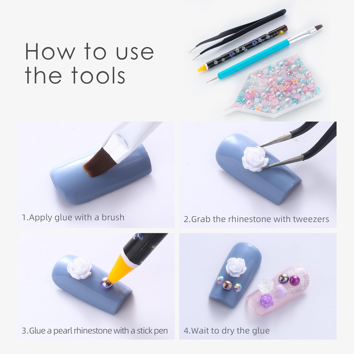 - Useful tools - These pearls and rhinestones have a flat back, which is excellent for easy placement.and you can pick up any large or small pearls and rhinestones with the crayons we bring along. And use the brush to smooth out the Gel, these tools will work very well