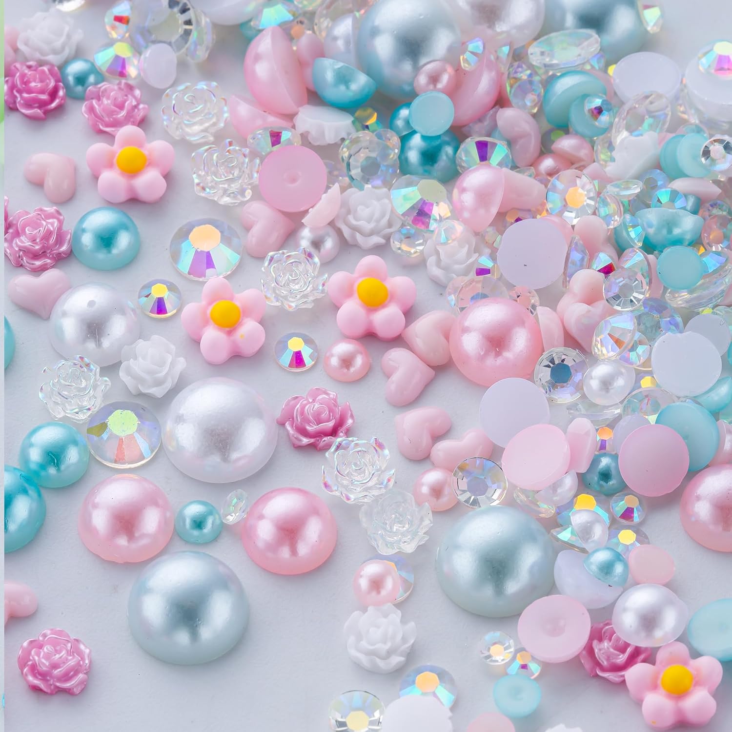 160g Cyan Pink Flat Back Pearls Rhinestones for Crafts Mixed Size 3mm-10mm AB Color Round Half Pearls Flatback Pearl Beads and Resin Rhinestones Set for Face Art