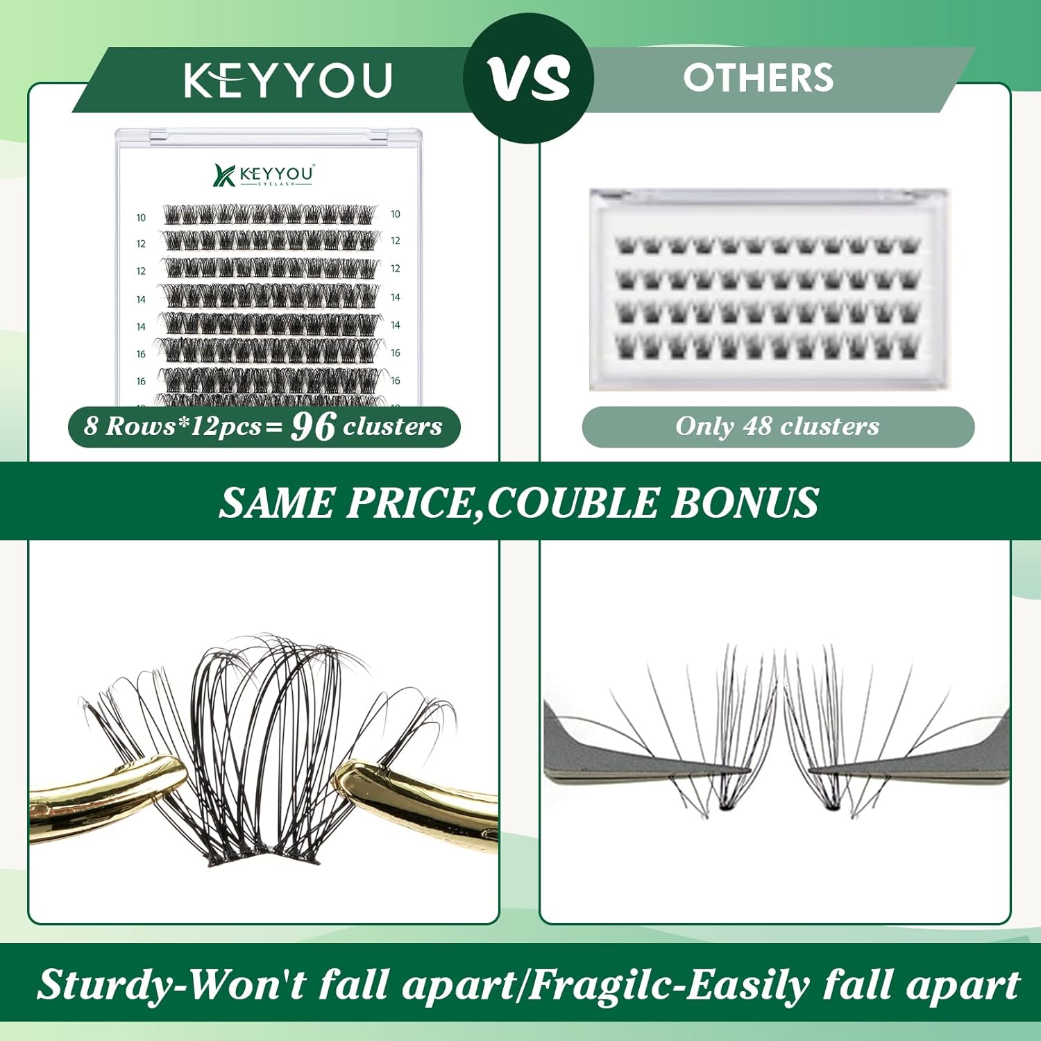 - 【Soft&Comfortable】KEYYOU lash cluster are made of imported materials,the stem line is thinner and softer, the eyelash cluster are lighter and more comfortable to wear.96 clusters in one tray ,more cost-effective.
