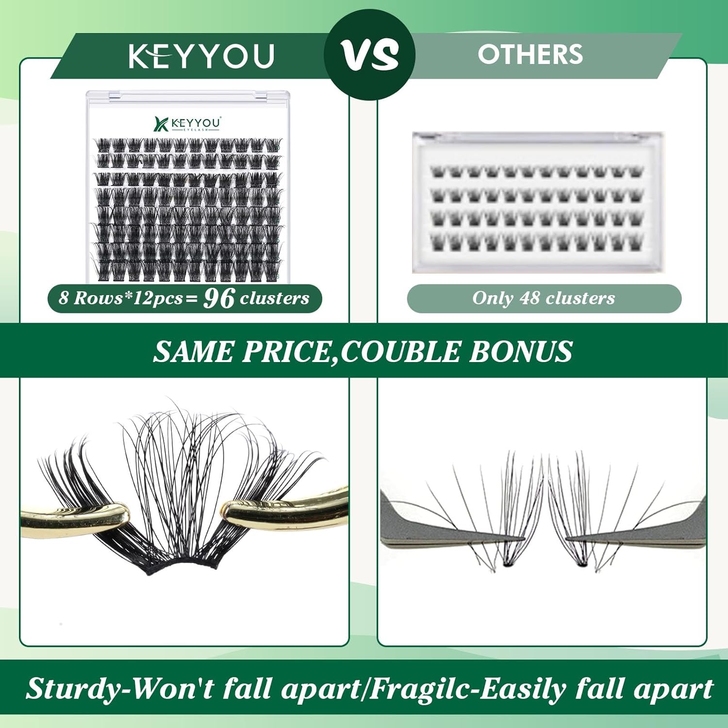 - 【Soft&Comfortable】KEYYOU lash cluster are made of imported materials,the stem line is thinner and softer, the eyelash cluster are lighter and more comfortable to wear.96 clusters in one tray ,more cost-effective.