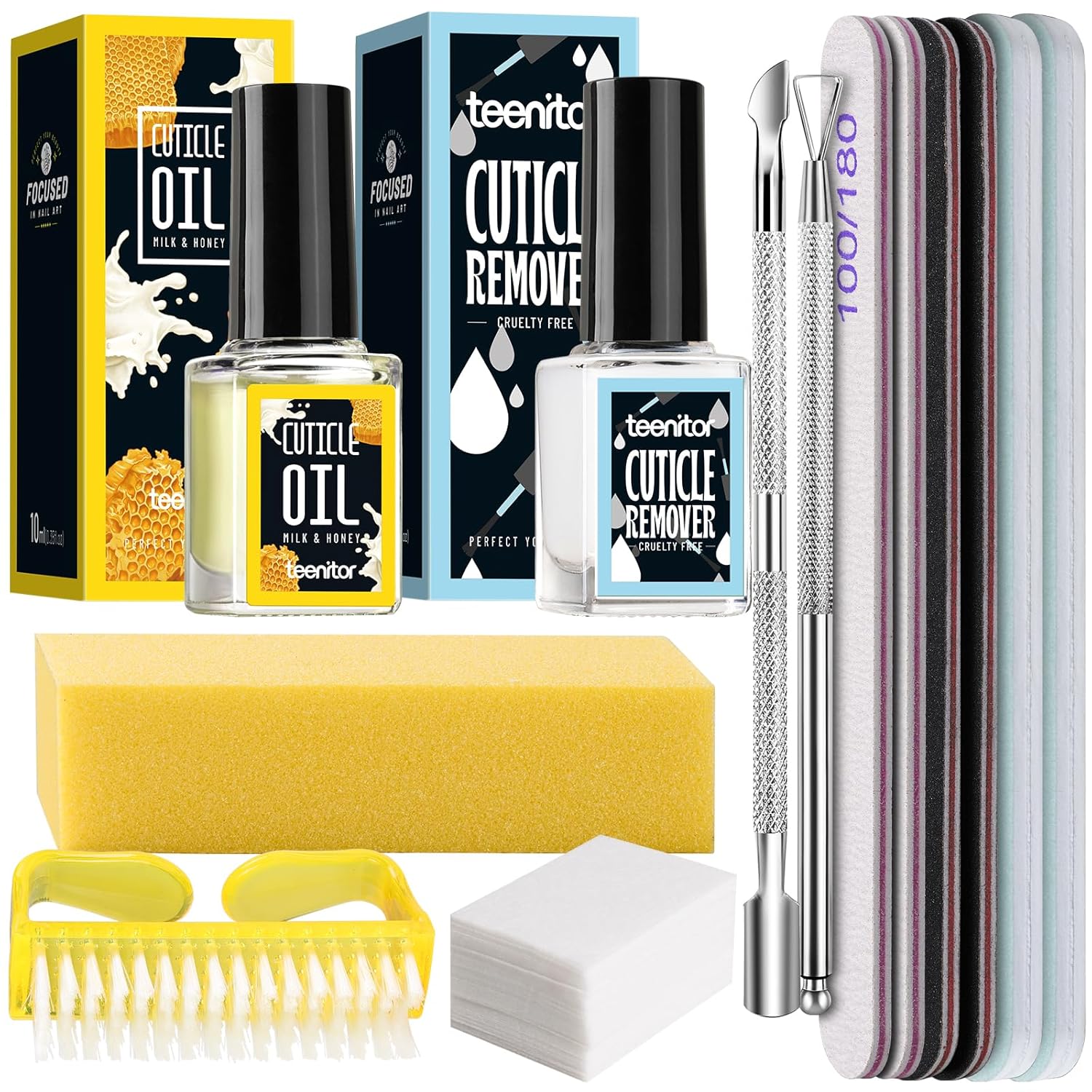 - Everything u need: cuticle remover kit comes with 2*100/180 black grit nail files + 2*100/180 gray grit nail files + 400/4000 nail file + yellow nail buffer block + 10ml cuticle remover + 10ml honey and milk cuticle oil + cuticle peeler scraper + cuticle pusher + brush + 50 pcs nail remover pads. Perfect manicure tools kit for beginners