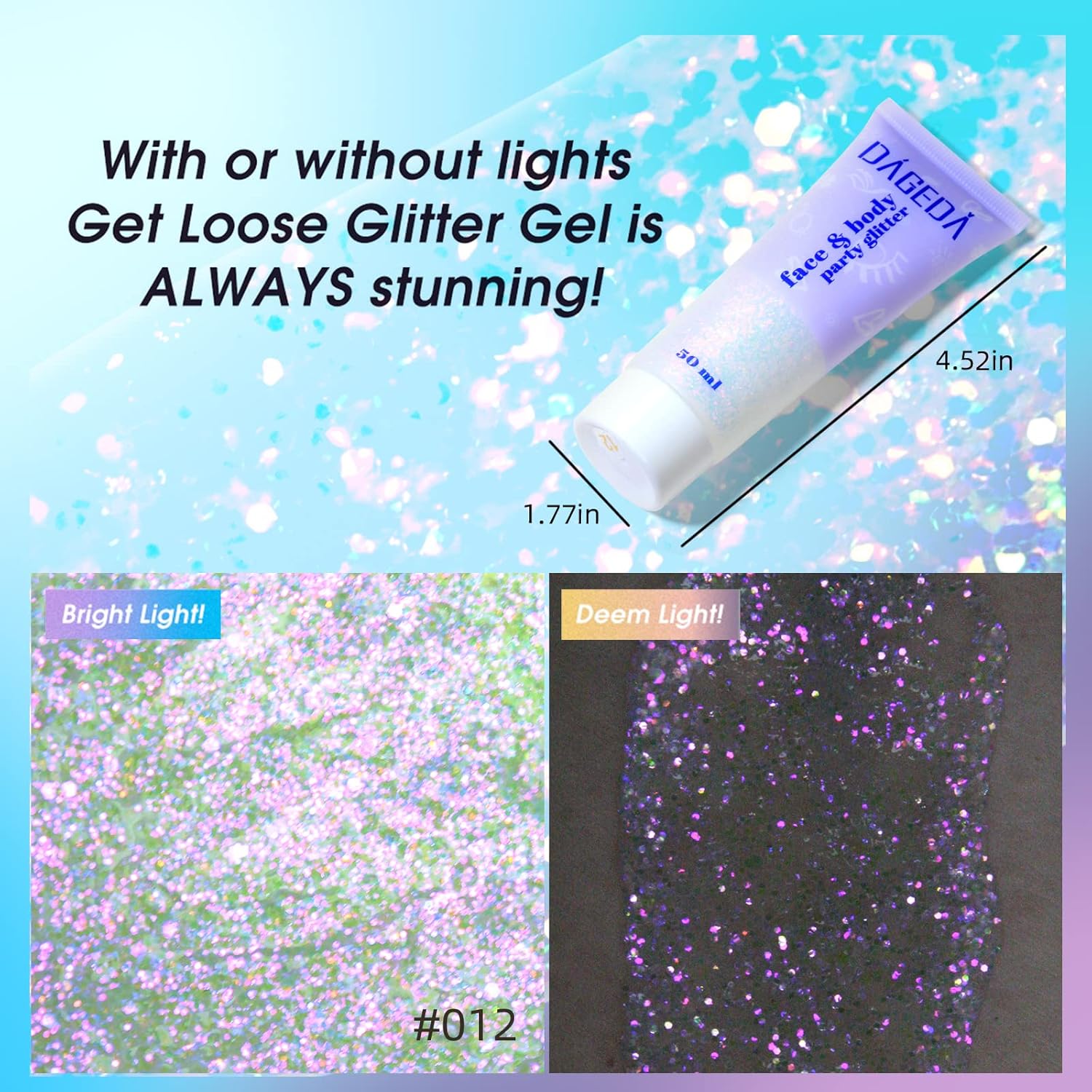 - 【Shining in the nightlight】When the lights are low, glitter gel also has a shimmering effect, which will make your skin sparkle in the dark and add to your charm.