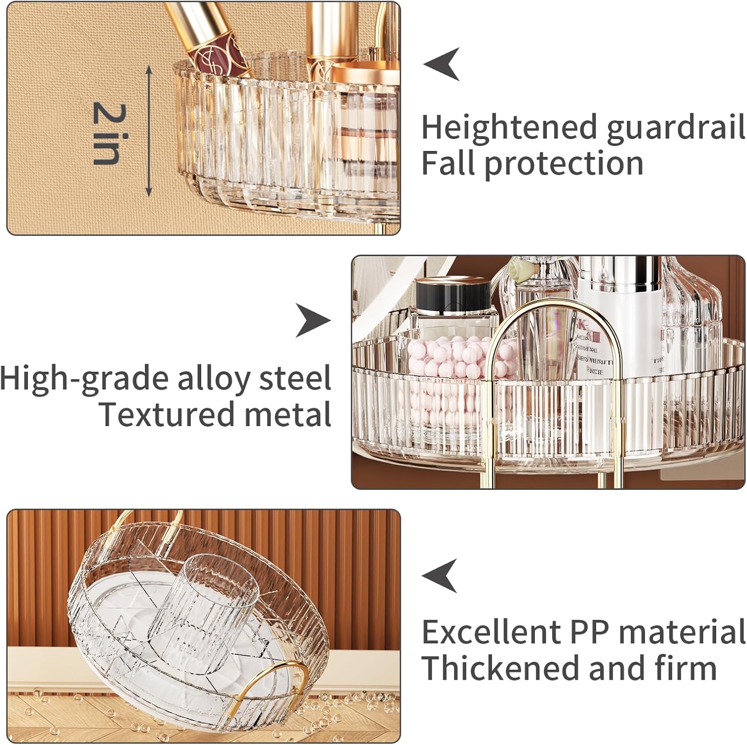 - 【360° Rotation】: The large-capacity makeup organizer allows you to store your cosmetics and skincare products in a clean and orderly space, 360° smooth rotation allows you to quickly find what you need, It's very convenient. The raised edges prevent cosmetics from falling off during rotation.