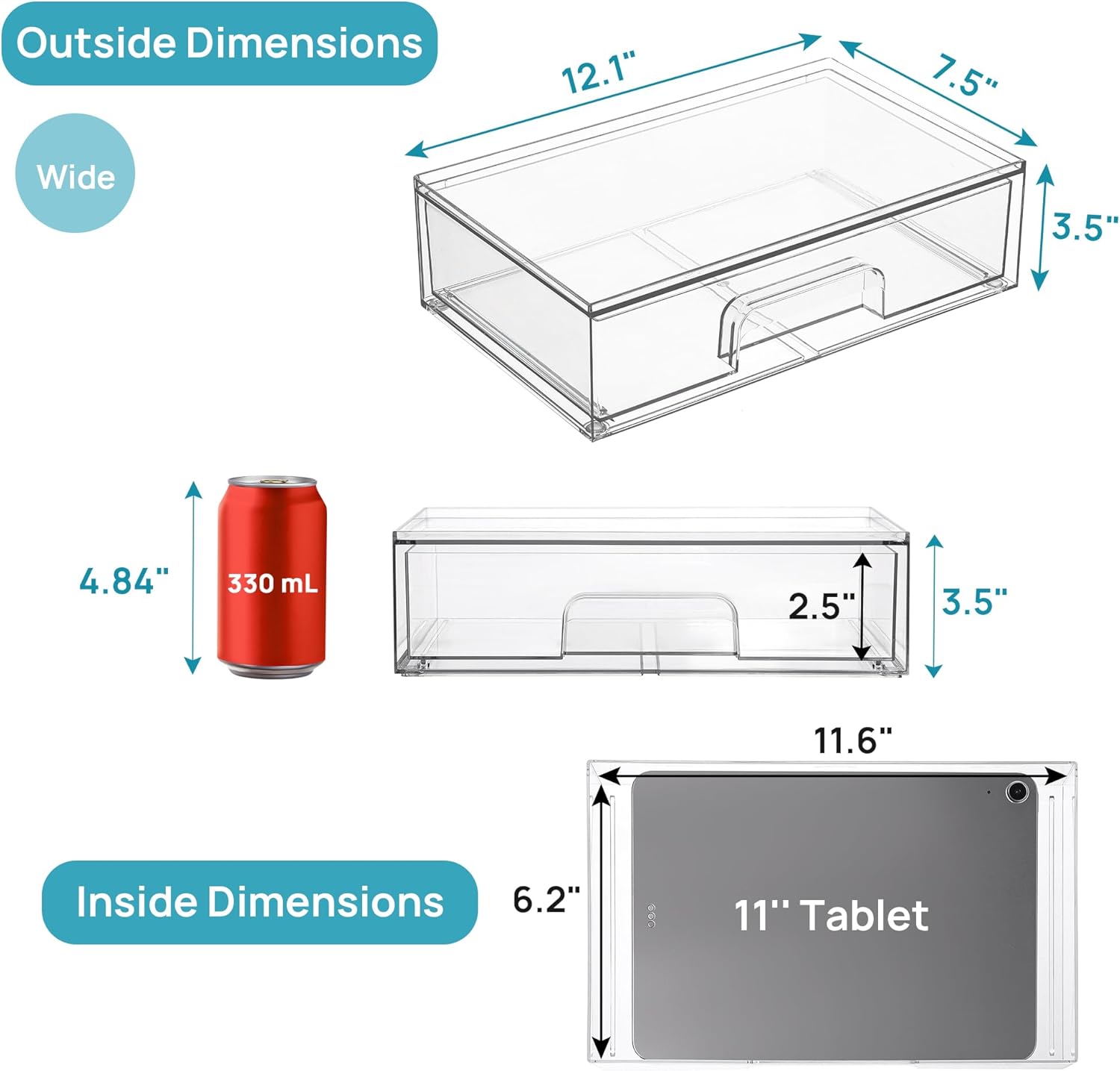 - [Stackable Design] Come with 2 drawer storage organizers, the outside box measures 7.5"D x 12.1"W x 3.5"H,the drawer measures 7.2"D x 11.6"W x 2.5"H,it is usable size.The storage containers are stackable, vertical storage will save a lot of space. You can also use them side by side. Put your small objects on top of acrylic bins to make your countertop space more tidy.