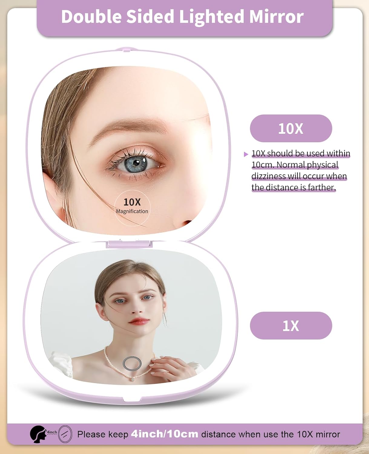 - 10x Magnifying:One side is a 1x HD mirror, equipped with white light to better restore your beauty, and the other side is a 10x magnifying mirror, which can help you magnify facial details. Tip: When using the 10x magnifying mirror, please keep a distance of less than 10 cm, otherwise it may cause normal dizziness and affect imaging