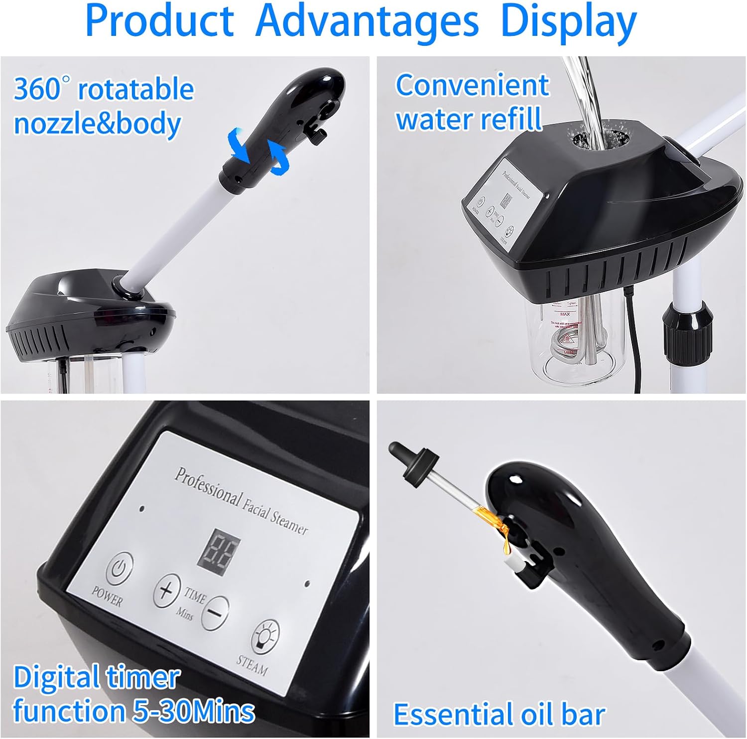- 【Facial Steamer Adjustable】This height of this face steamer for facial deep cleaning can be adjusted from 36~52 inches, with a 360° rotated nozzle and a 360° rotated main body, 360° rotatable wheels, which is very suitable for spa or home personal care.