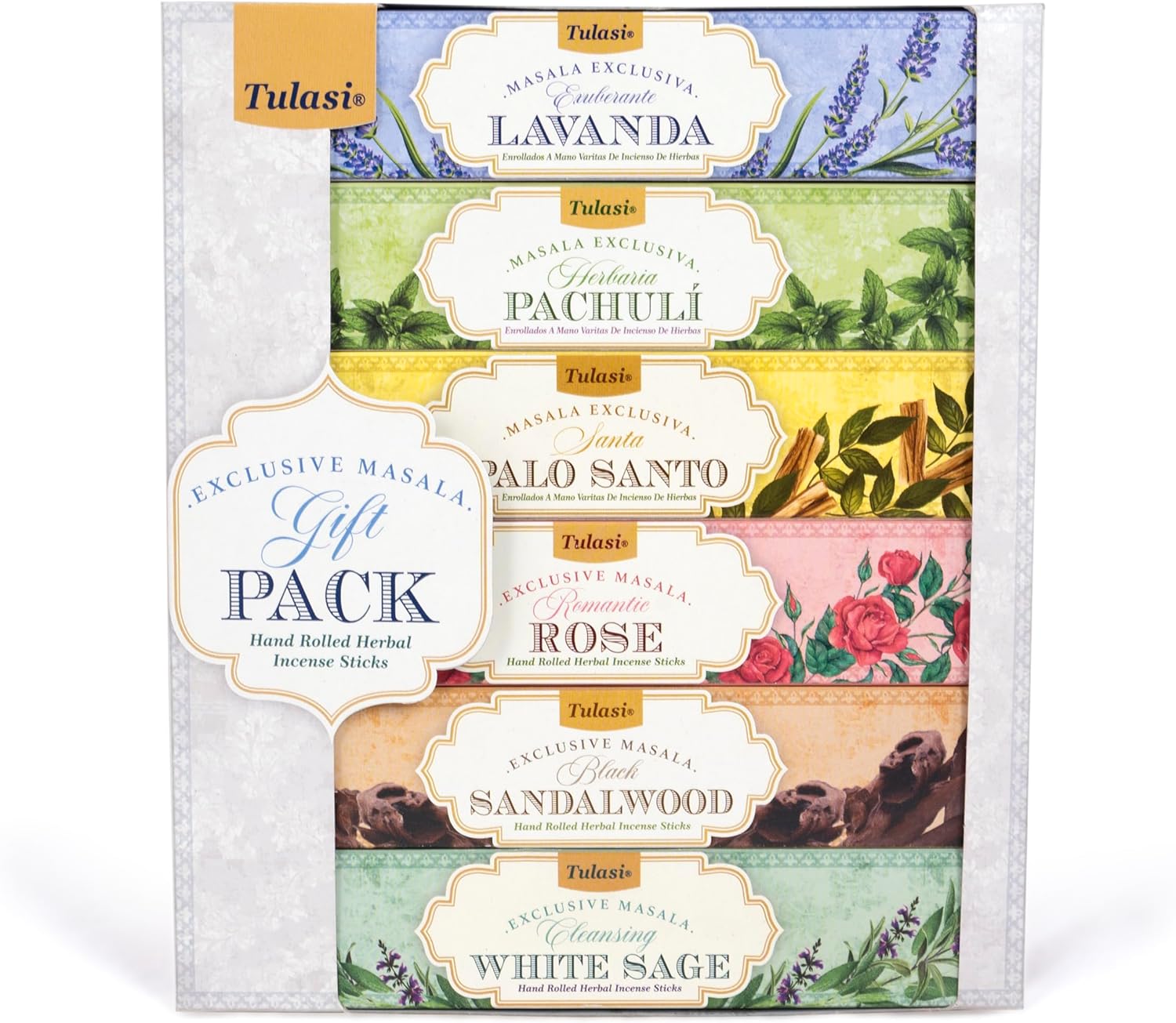 - SET OF 6: This Tulasi Masala Incense Stick Gift Pack includes 6 different fragrances boxes, each box contains 20 sticks, 120 incense sticks (6 x 20N) | Lavanda, Pachuli, Palo Santo, Rose, White Sage & Sandalwood.