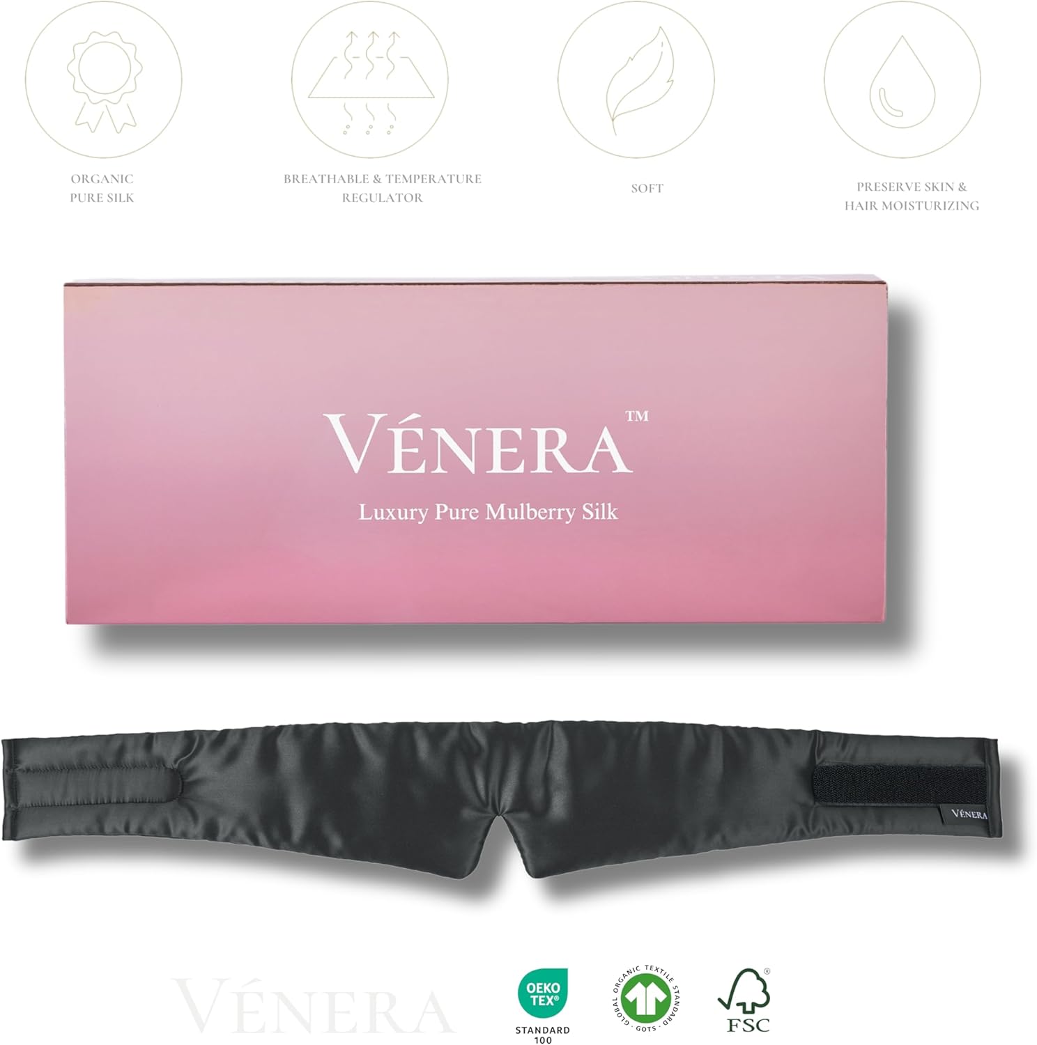- Fully Adjustable: The wide cushioned Vénera Silk Cloud Mask confidently fits all head sizes with its fully adjustable design. It is highly effective in blocking out all sleep-interrupting light and remains securely on your face in all sleep positions, making it the perfect choice for side sleepers.