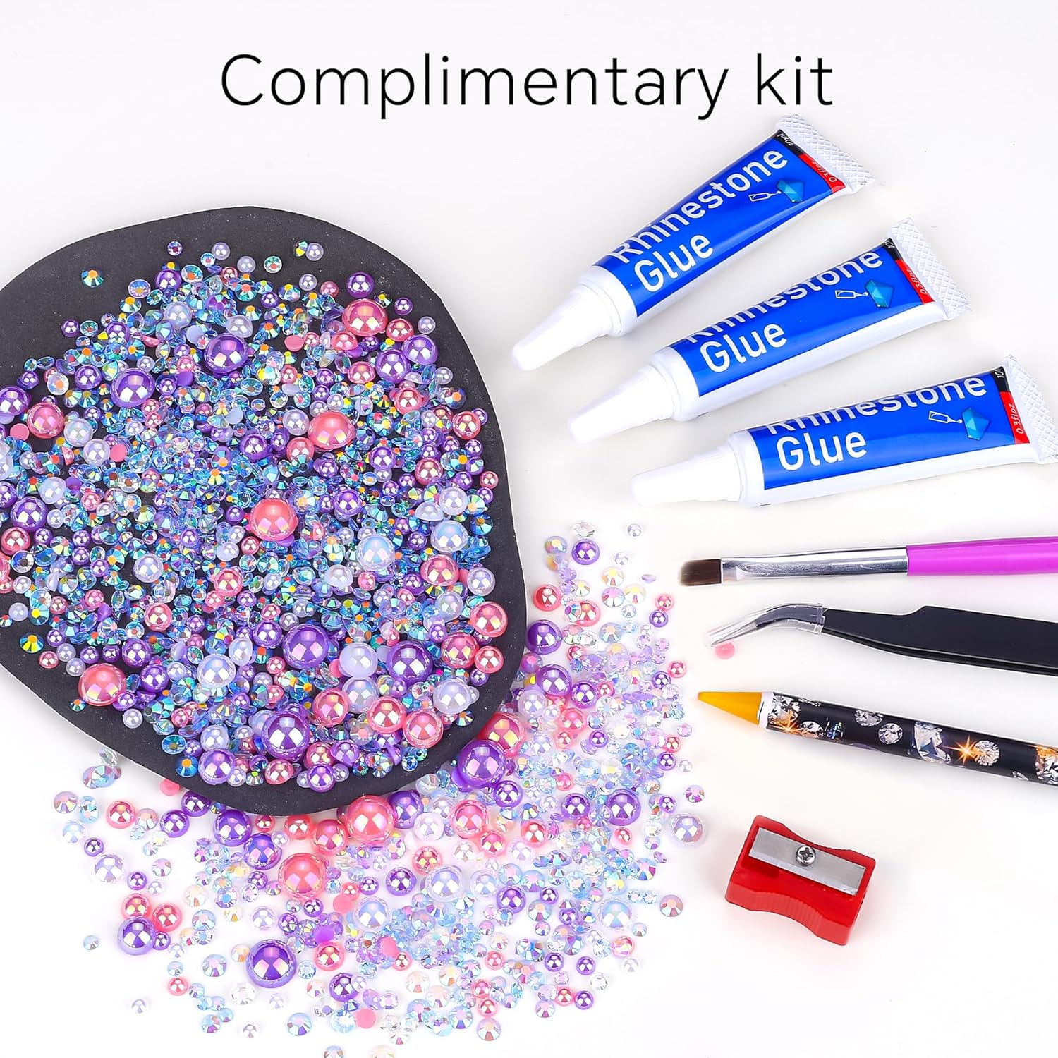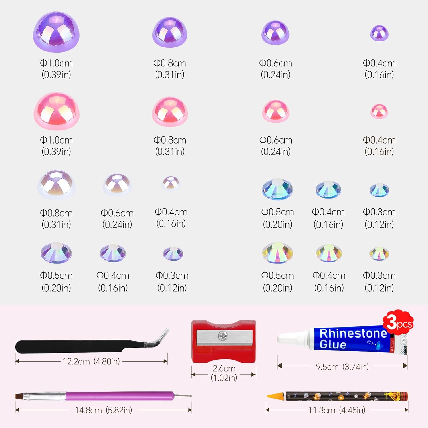 - What You Will Receive: 60g(30g*2)mixed size flat back pearls and rhinestones. 3*Rhinestone Glue. 1* wax pencil for rhinestones. 1*Pencil sharpener(color random). The mix half round pearls and rhinestones can make more beautiful handicrafts for your friends, parents, yourselfs on any festivals.If you need a mixed size pack of pearl rhinestones