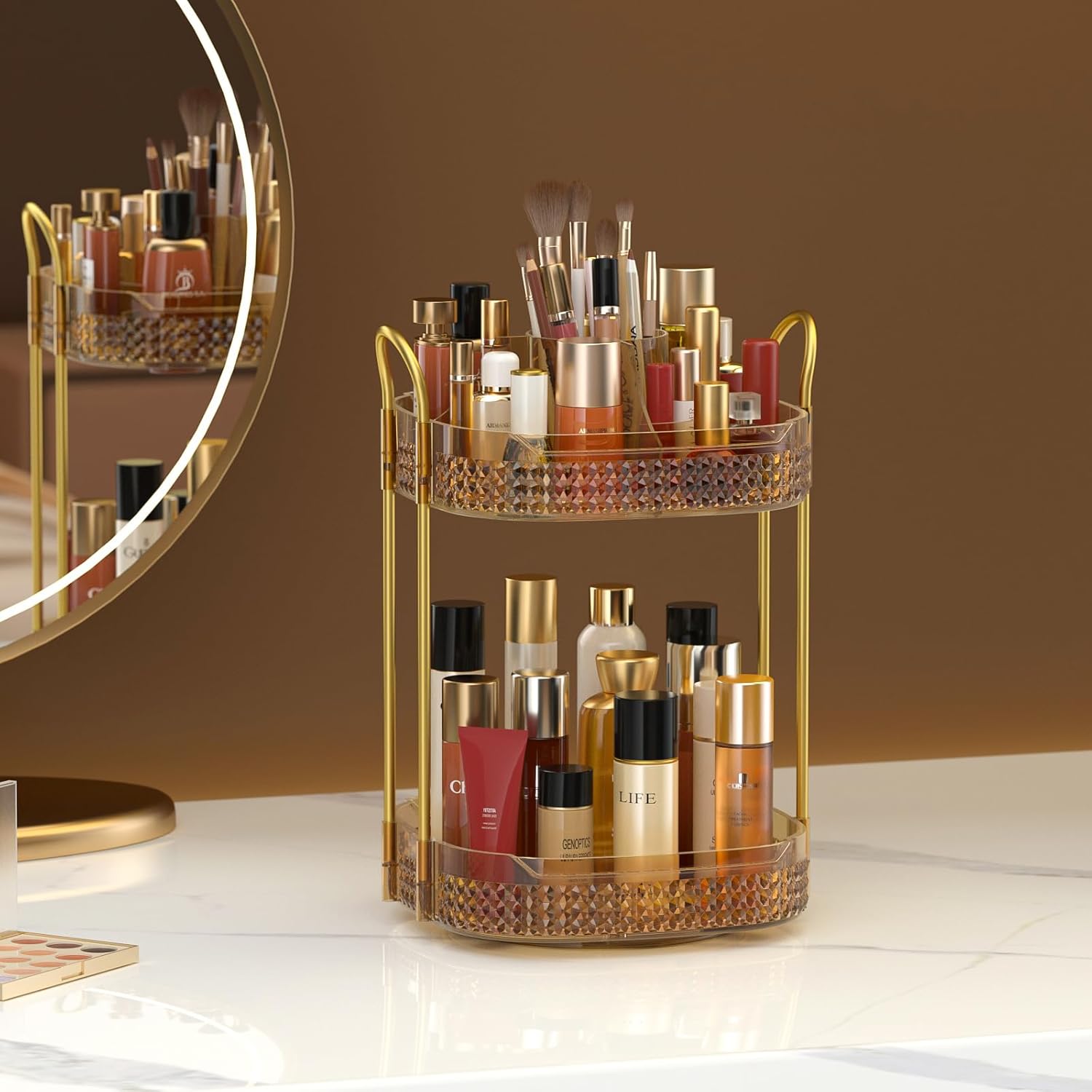 Awenia Rotating Makeup Organizer 360, Stackable Adjustable Large Capacity Cosmetic Storage Unit,Dresser Bathroom Kitchen Countertop Organizer with Metal Handle, Plus Size (Honorable Gold, 2 Tier)