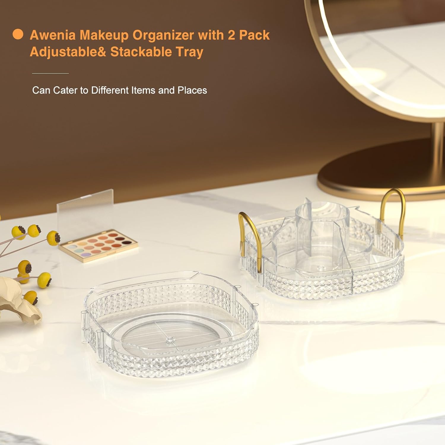 - Stackable &Adjustable:➤The lazy susan organizer is stackable if you get more Awenia clear bathroom countertop organizer and help you save 80% space.With separated top and raise,thicken edges, you can put long brushes,makeup bottle, don’t worry about falling. You can combine three adjustment plates of make up organizers according to your needs.