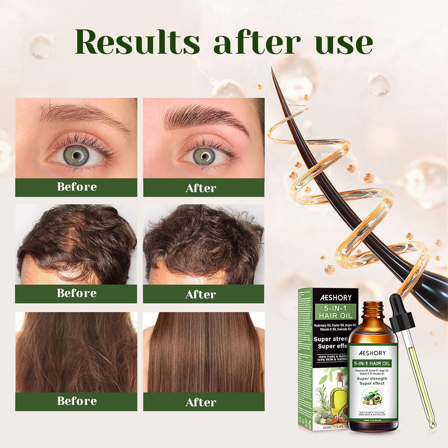 Aeshory Hair Oil - 5 IN 1 Hair Care Oil with Rosemary, Castor, Argan, Vitamin E, and Avocado for Hair Growth and Strengthening - Nourishing and Volumizing 3.38 fl oz