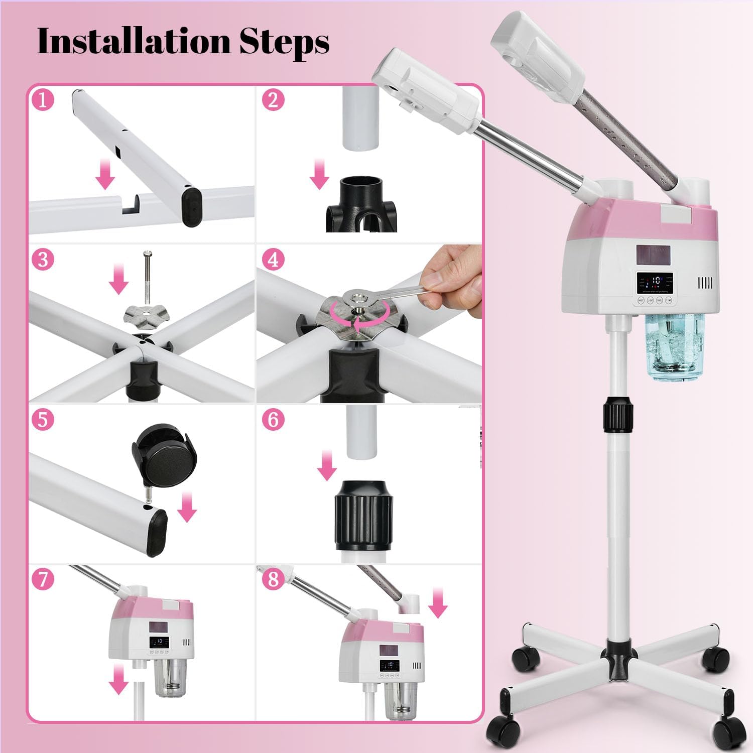 - đă360°Rotating for Convenient UseăAdjustable height retractable lift rod and universal rolling wheels meet your different needs.And the steam nozzle can rotate 360°, allowing for easy adjustment of height and positioning for the face, neck etc. Whether sitting or lying down, it is convenient to moisturize every part of the body.