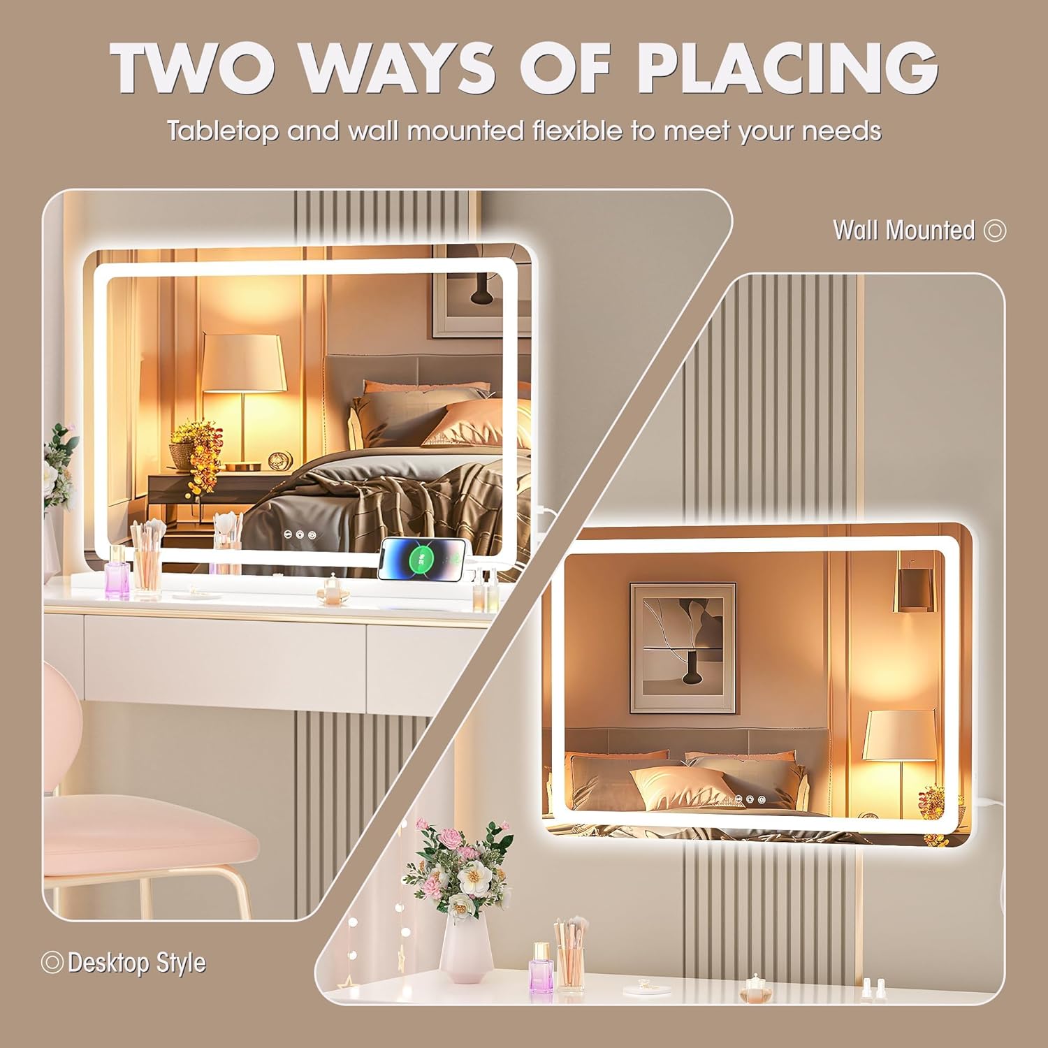 - đăDetachable Mirror Base & Hanging settingăWall mounted or Table Top design meet your different needs.This large makeup mirror designed with detachable base and two back hole for nail. 1.Removing mirror base with a screwdriver. 2.Knocking two nails on the wall. 3.Hanging mirror on the wall.