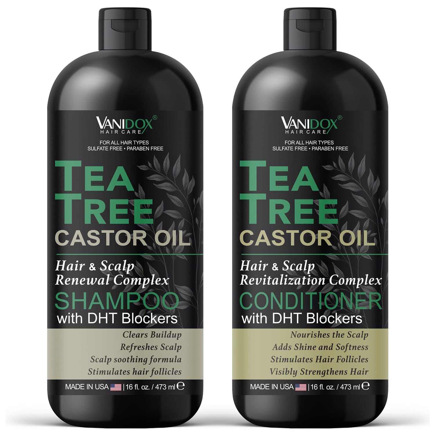 Tea Tree Oil Shampoo and Conditioner Set with Castor Oil, DHT Blockers, Itchy Scalp Relief, Supports Fuller Hair, Cleanses Dandruff & Buildup, For Men & Women, Made in USA, 16 fl oz Each