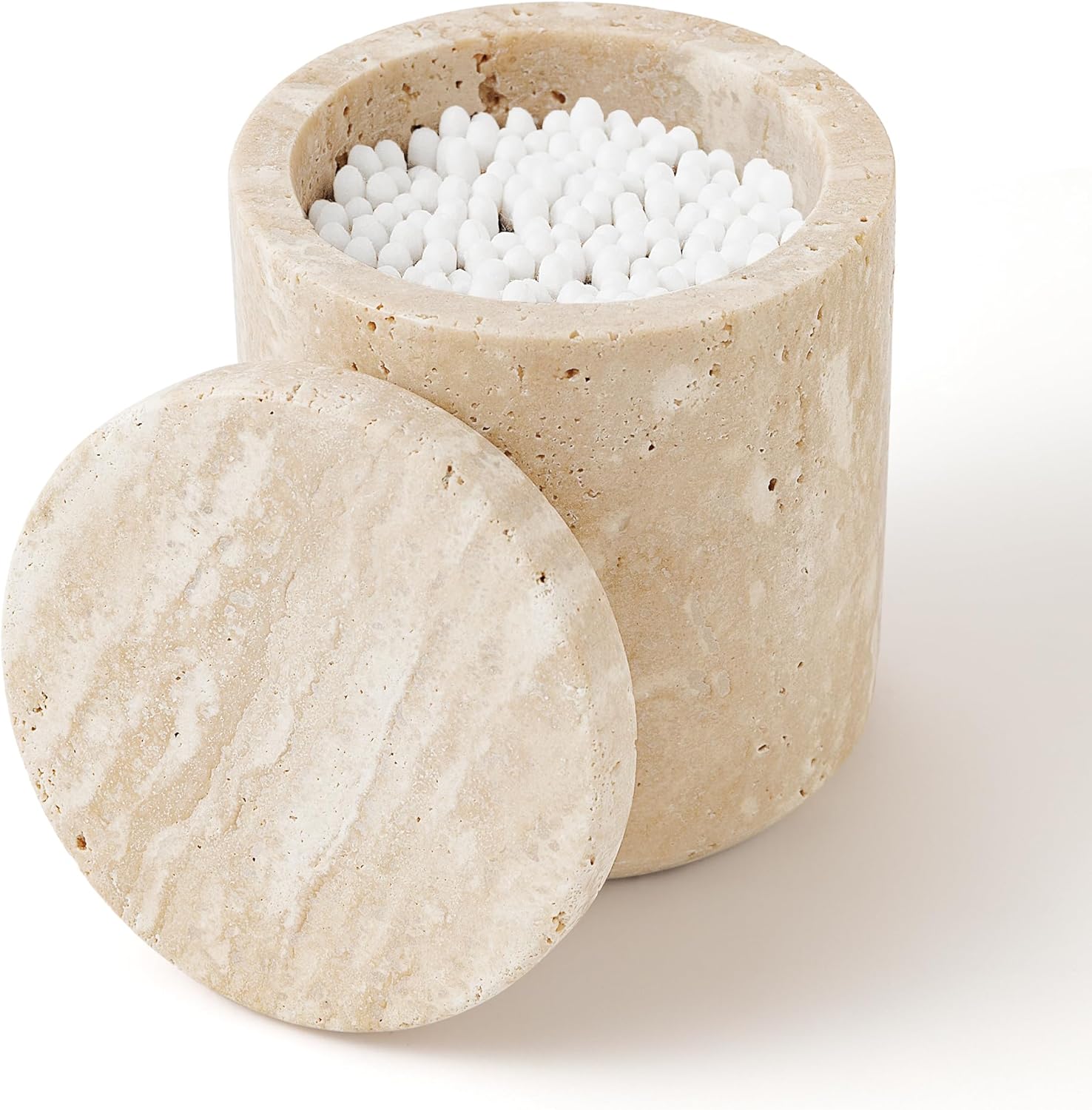 WORHE Travertine Qtip Holder Dispenser with Lid for Cotton Swabs,Balls,Pads,Floss Picks Large Capacity Marble Apothecary Jar for Bathroom Essentials Decor, Vanity Makeup Storage Organizer Beige(WH050)