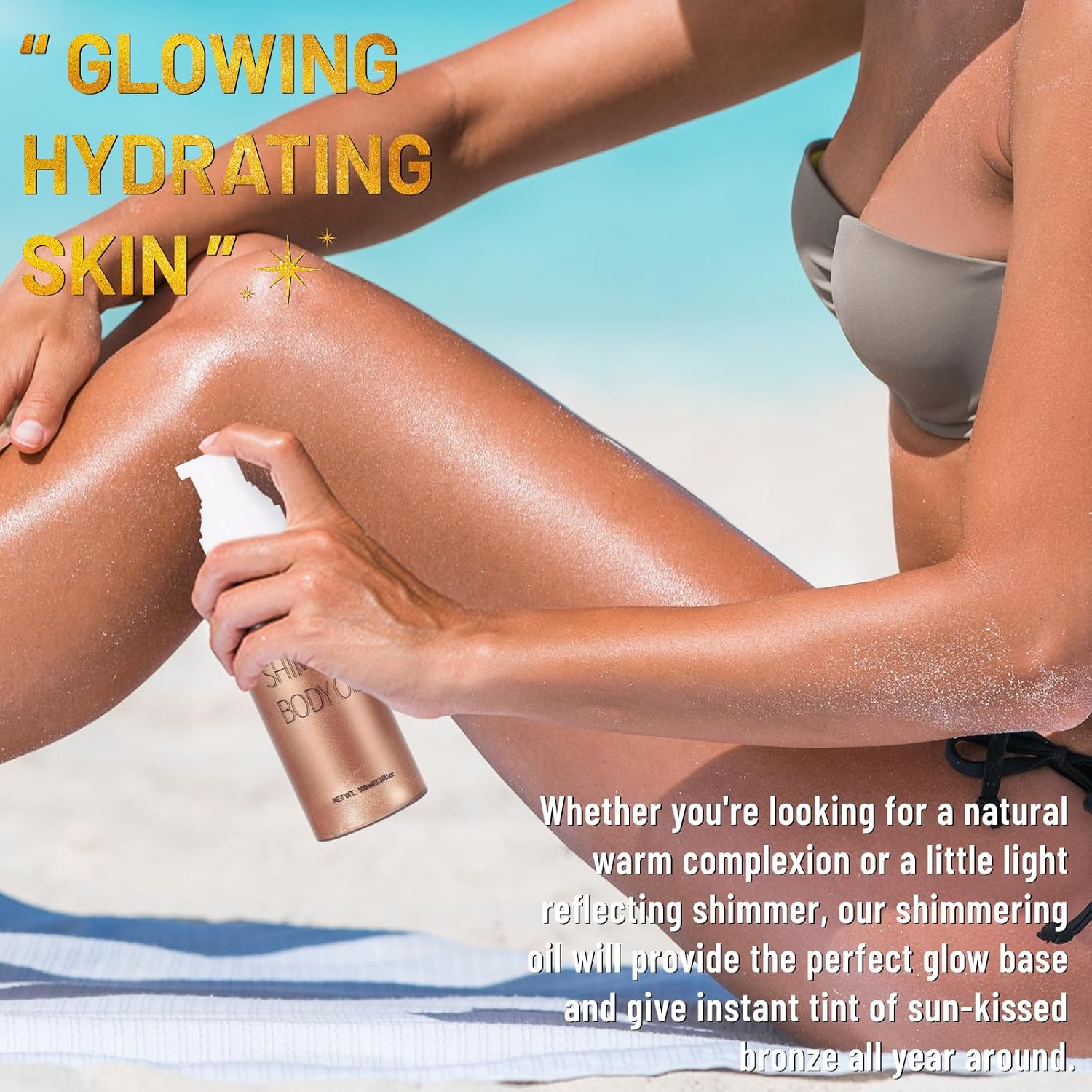 - 【UCANBE 100ml Shimmer Body Oil Glowing Luminizer】This shimmering body glow oil made to top off your natural-looking healthy glow and brightens your complexion, the flecks of shimmer catch the light and make your skin shine, get you instant bronze skin look with some glitter, giving skin an attractive shimmer in the sun. Definitely a must-have for girls and women to keep their skin hydrating and glowing all year 'round!