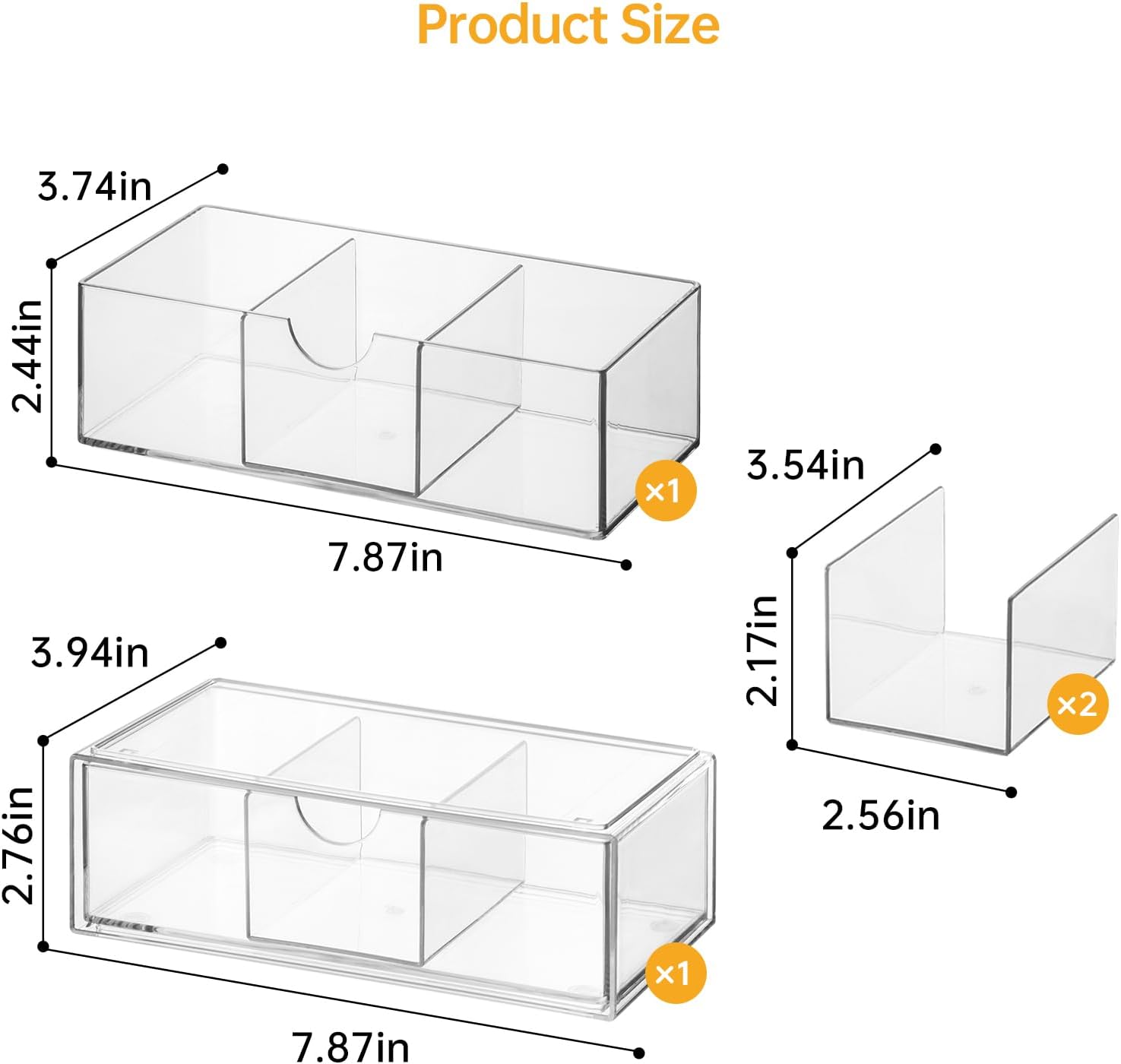 - Item Details: This 2 tier medicine cabinet organization set includes top clear compartment box ×1, size: 7.87×3.74×2.17 in; and bottom clear drawer compartment box ×1, size: 7.87×3.94×2.76in; also comes with two adjustable compartmentalized tier pieces