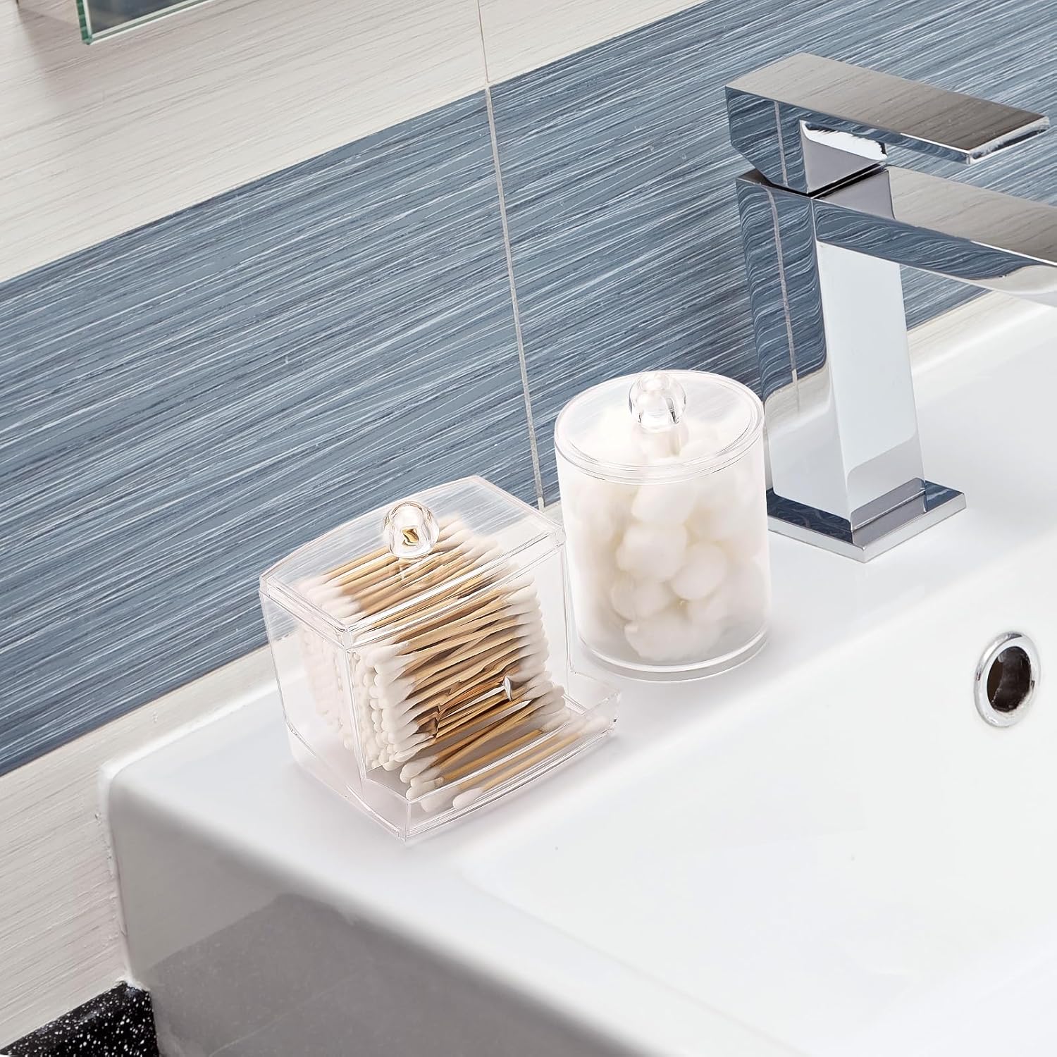- Bigger than Before - Compared to the previous one, this one is bigger, 1pcs Qtip Dispenser - 10oz (3.8x3.2x3 in), 1pcs Cotton Ball Holder - 12oz(3.6x3 in). Putting&Picking cotton swabs more easier