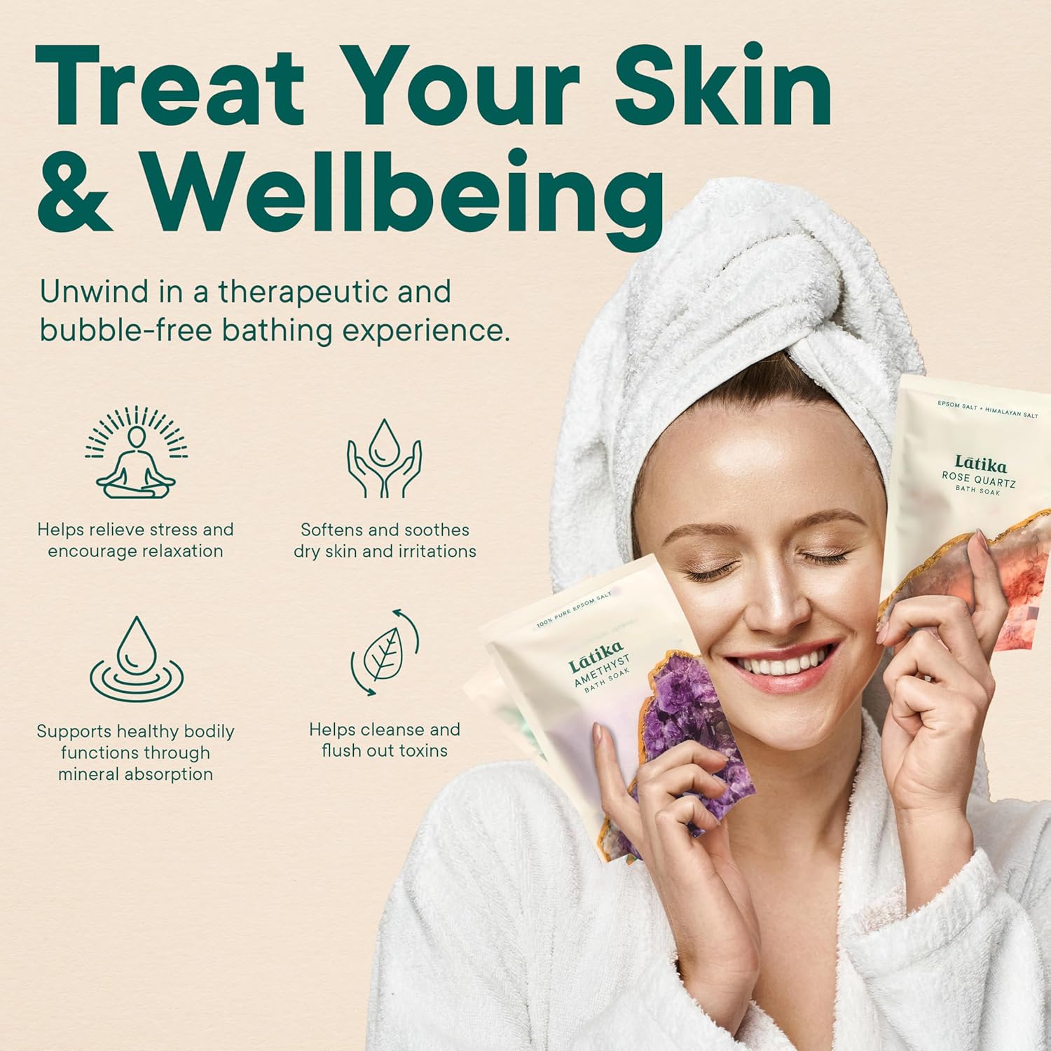 - SKIN NOURISHMENT – Infused with natural minerals and vitamin E, our Geode-inspired bath salts provide luxurious hydration. Enjoy silky-smooth, healthy skin after each soak, enriched with essential oils from rose quartz, lavender, fir needle, and cedar bark.