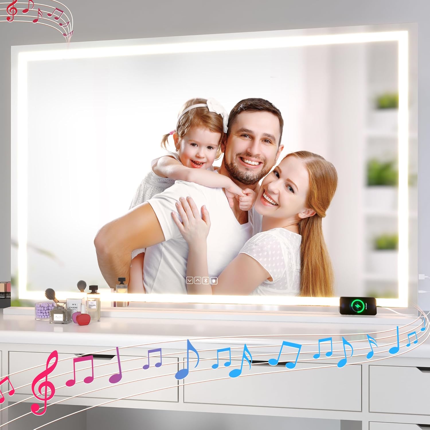 Hasipu Vanity Mirror with Lights and Bluetooth Speaker, 42" x 29.5" LED Makeup Mirror, Lighted Makeup Mirror with Dimmable 3 Modes, Touch Screen Control Vanity Mirror Square White