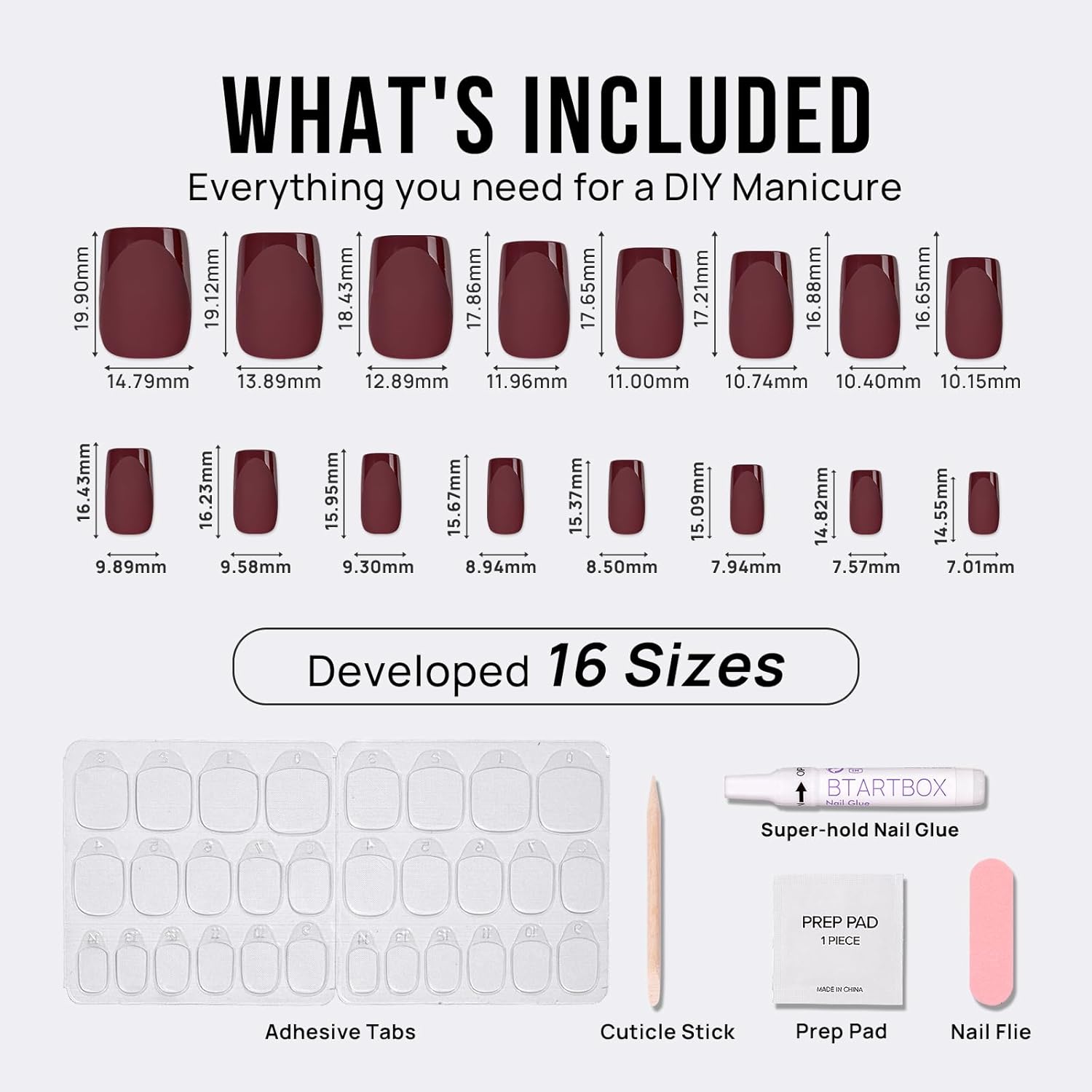 - What's Included: 16 nail sizes ensure a totally custom fit, plus we give you everything needed just in case! Each set comes complete with a storage box, nail glue, adhesive tabs, double-sided nail file, cuticle stick, and prep pad